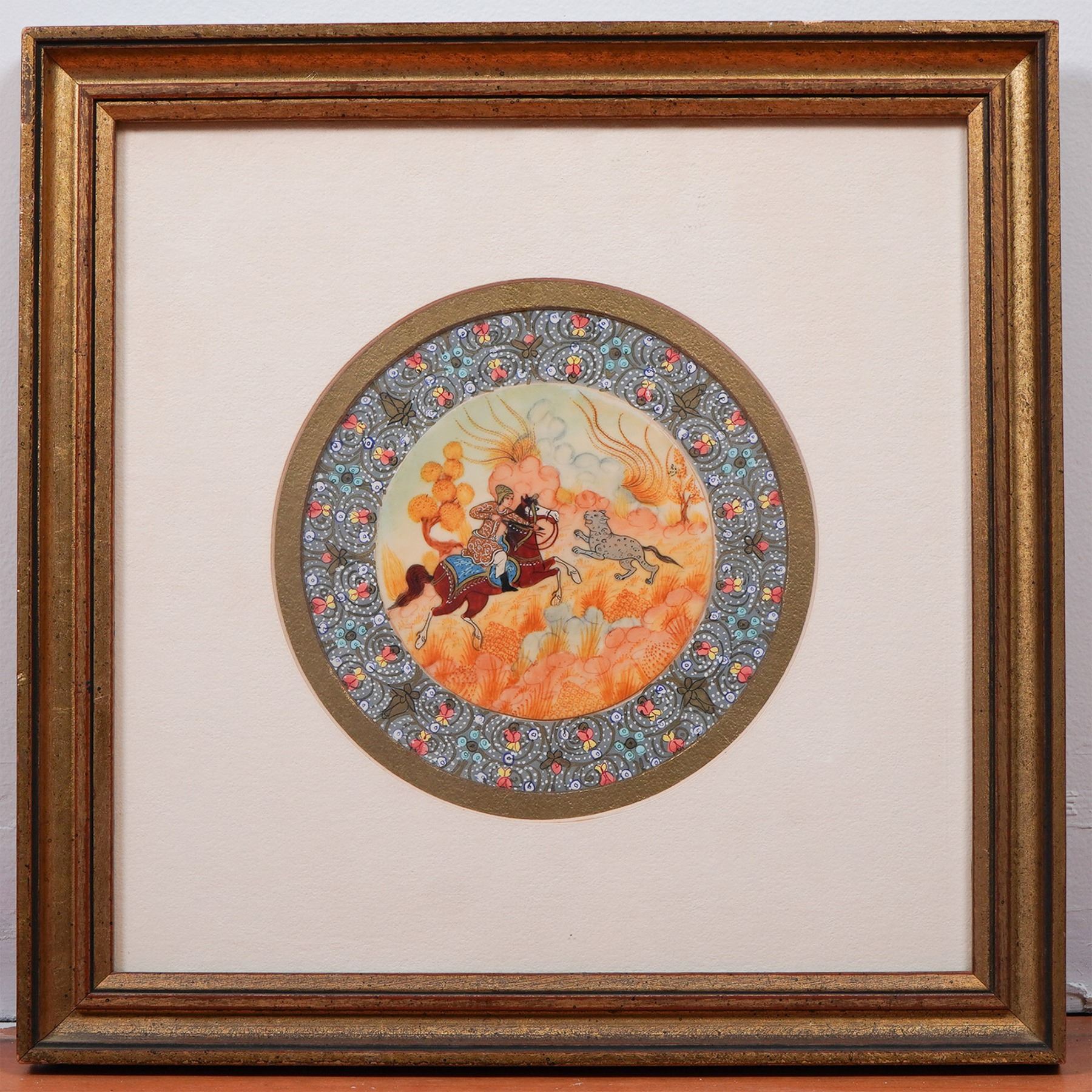 Persian Miniature Style Painted Plate on Paper, Equestrian Hunting, Signed