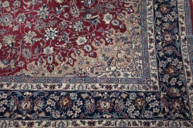 Last quarter 20th century. A Persian Nain Rug. Early 20th century. Central blue medallion surrounded by detached floral sprays on red ground. 9'3" x 6'.