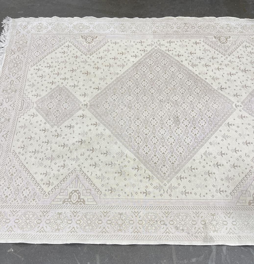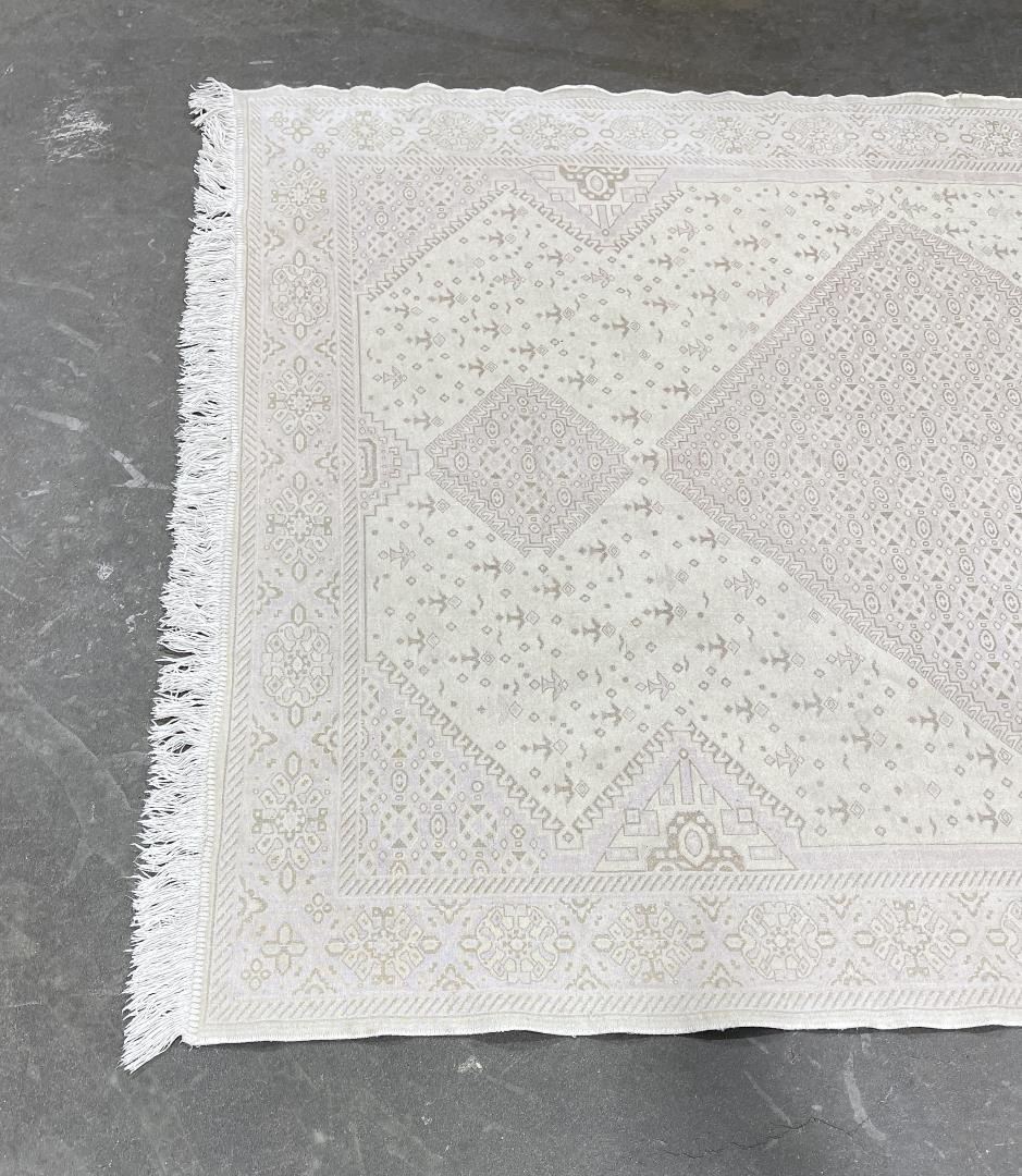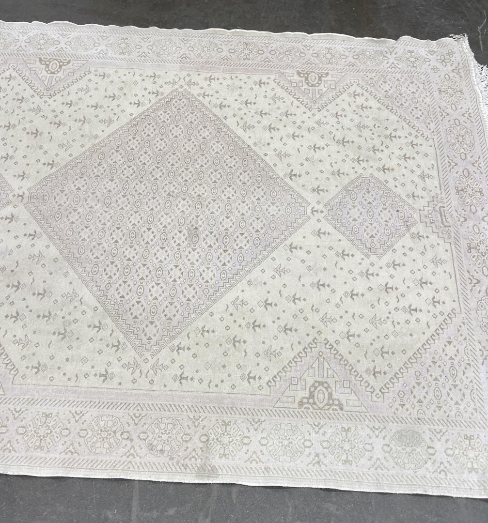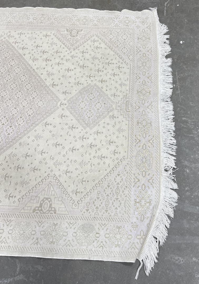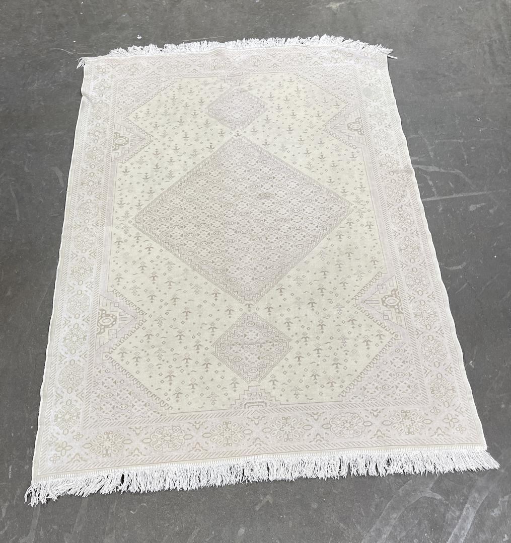 Very nice rug. All Ivory with hints of purple. 59.5" by 79.5" including fringe.