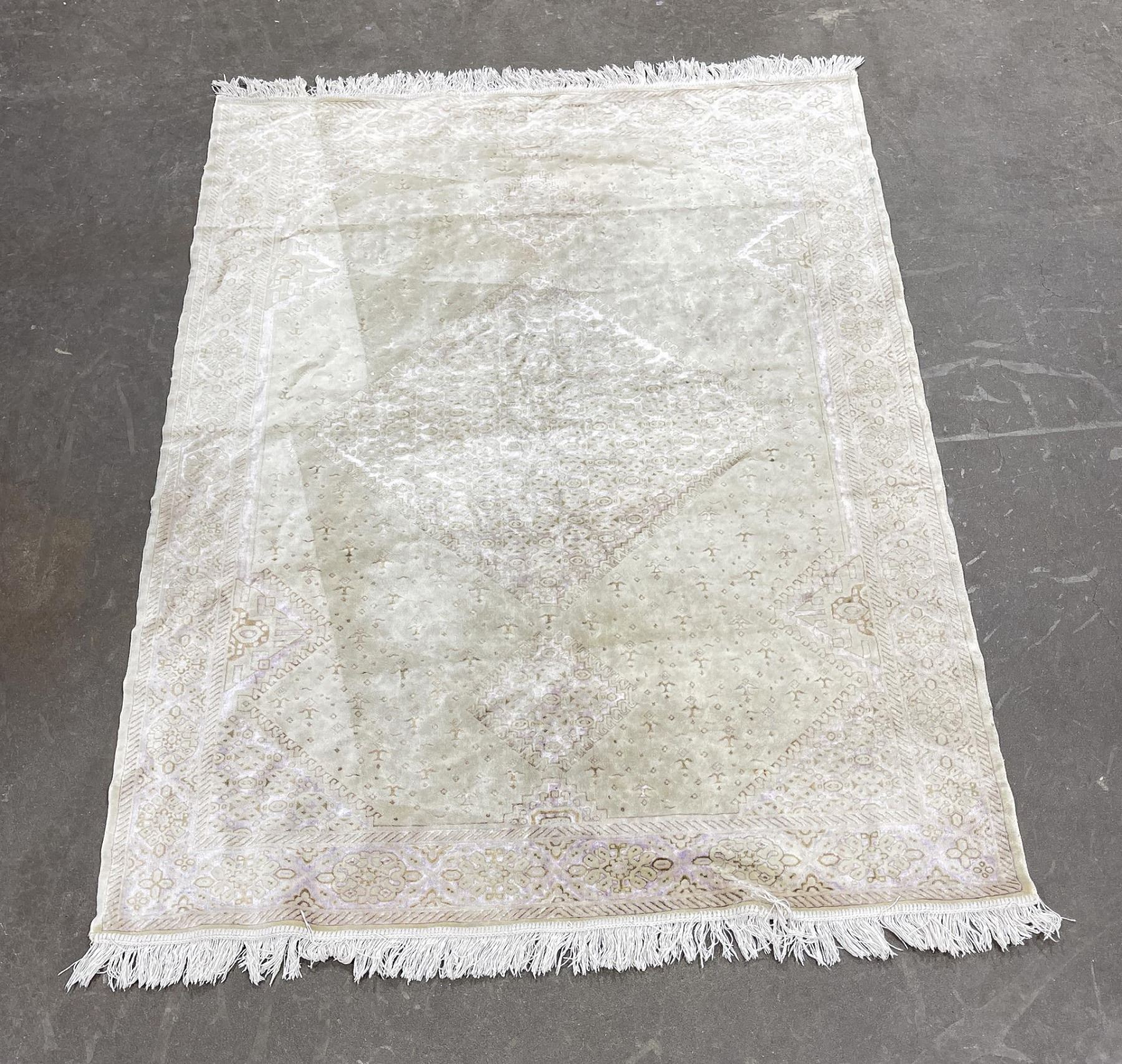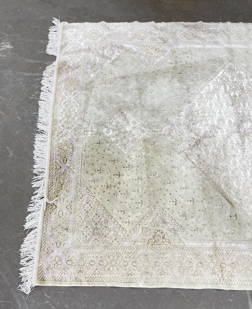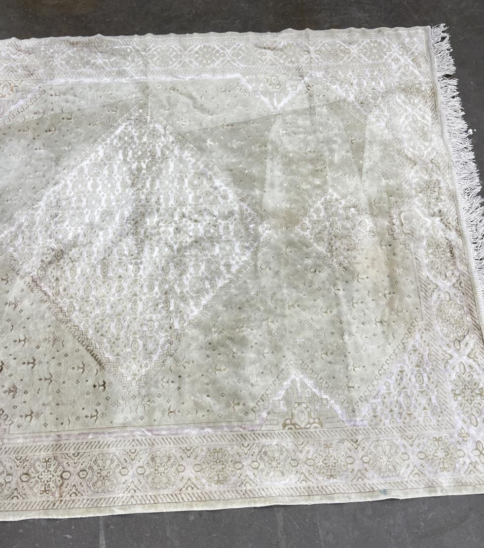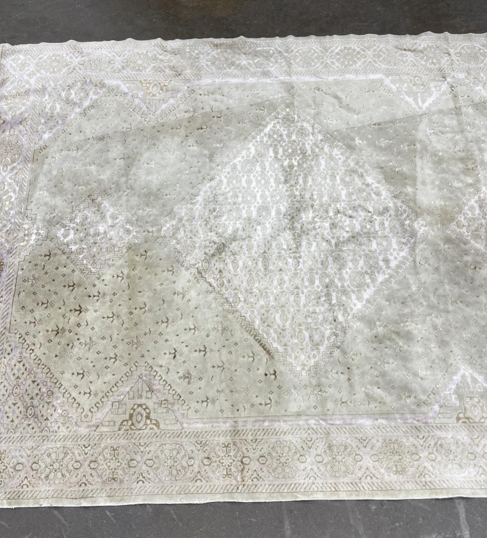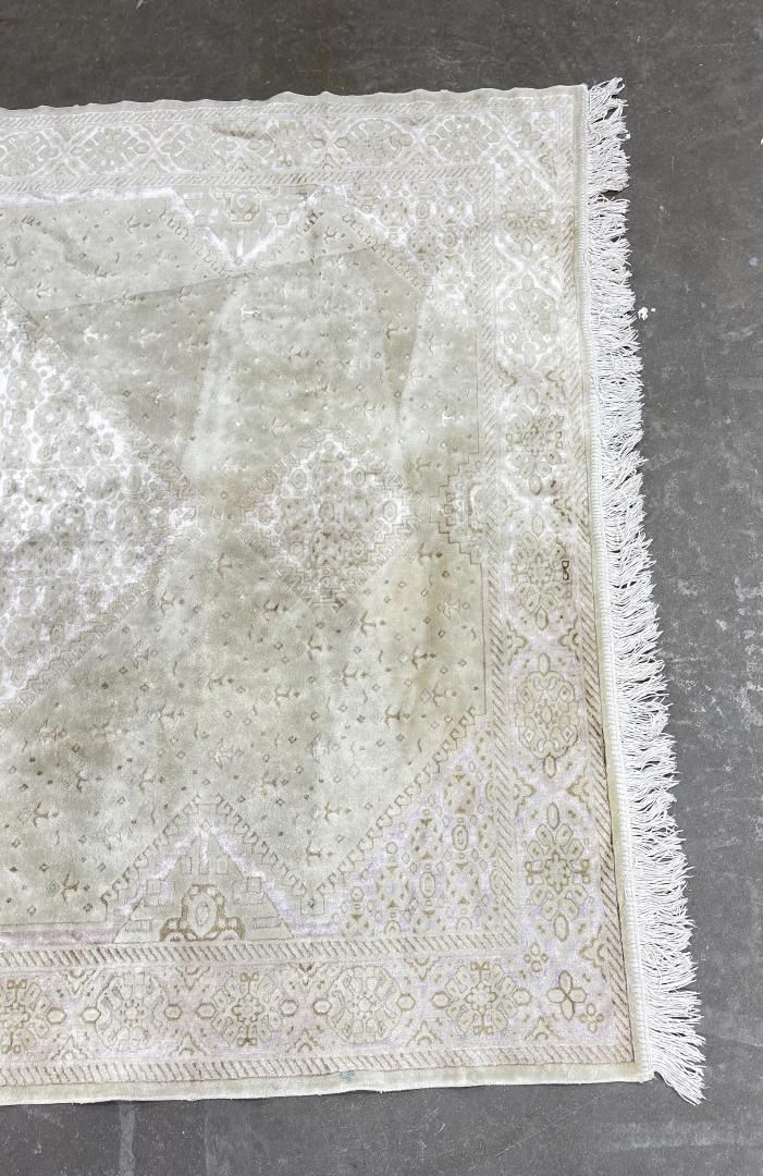 Very nice rug. All Ivory with hints of purple. 59.5" by 79.5" including fringe.