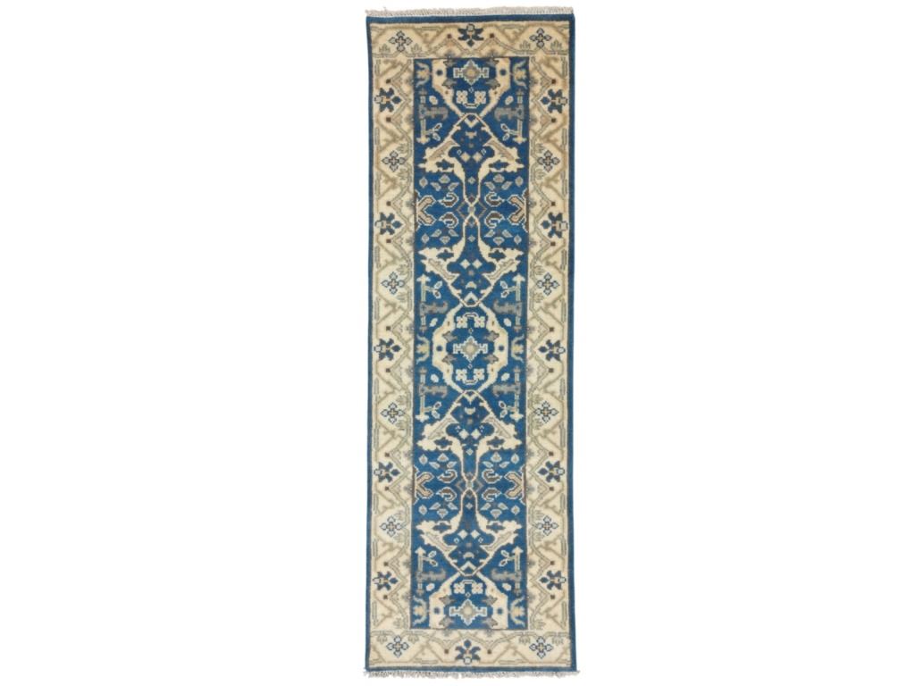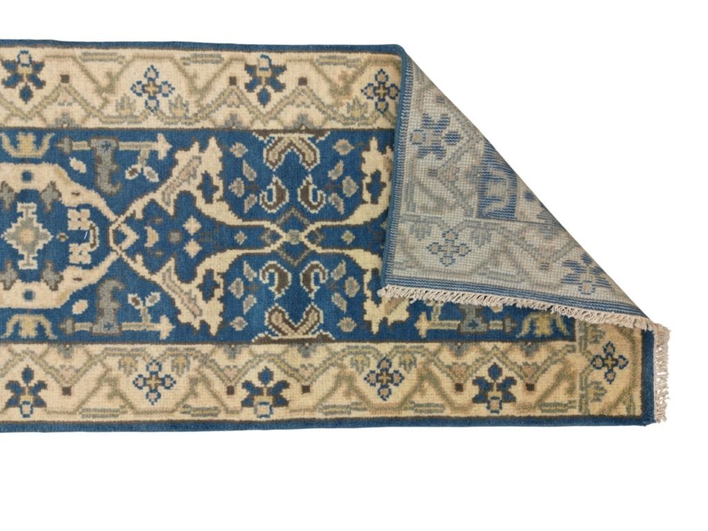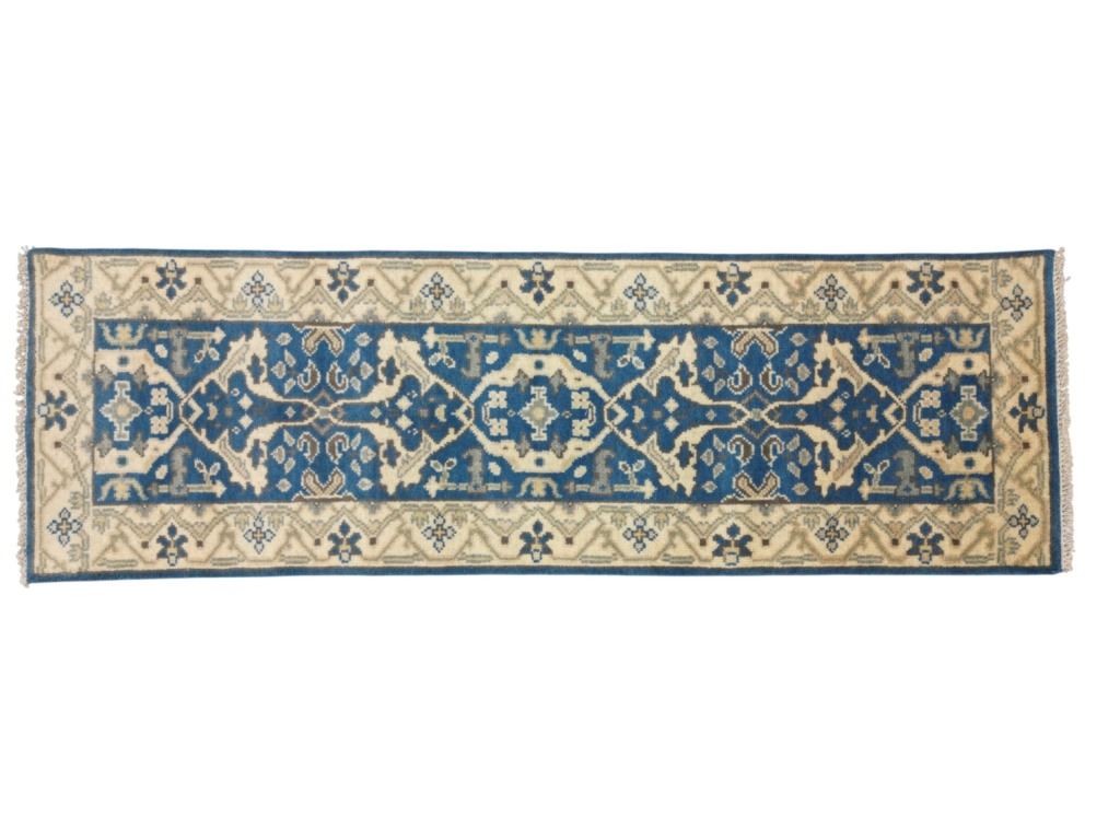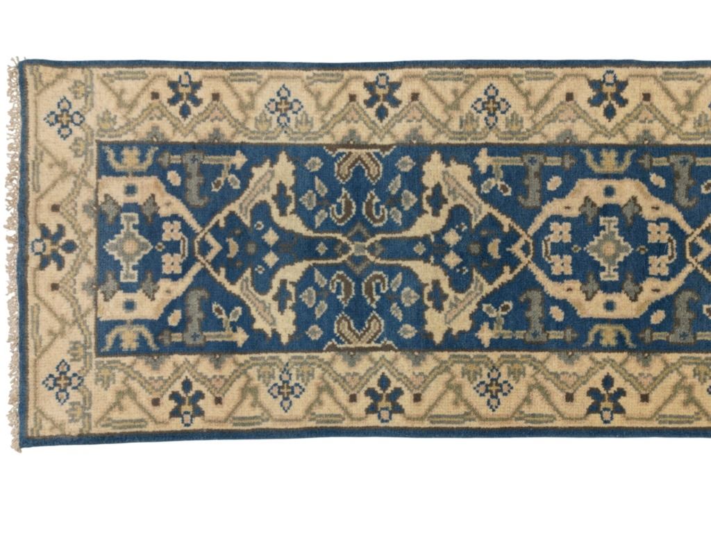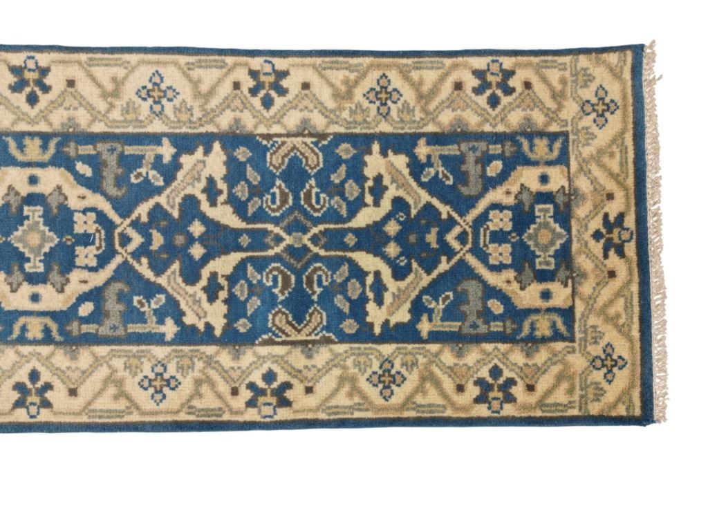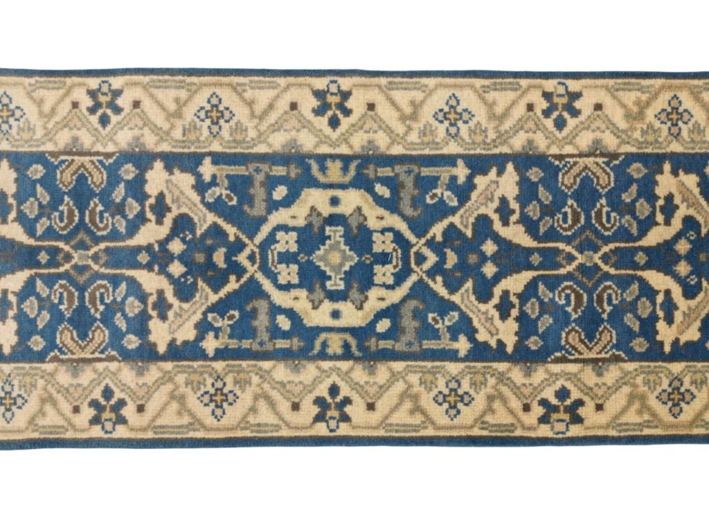 For your consideration is this Persian Oushak hand knotted wool runner rug. The rug features geometric floral patterns, light colors, and a tight weave. The Oushak rug is a style of Persian rug made in Oushak, located just south of Istanbul, Turkey. The Oushak rugs are known for their calm, muted colors and tame look. The rug displays geometric designs throughout the border of the rug and features a five medallion design in the center. It shows colors of beige, gray, light blue and cream / beige. It shows good condition overall with little to no wear present and no signs of damage noted. It measures 96" L x 30" W and weighs 10 pounds and 2 ounces.