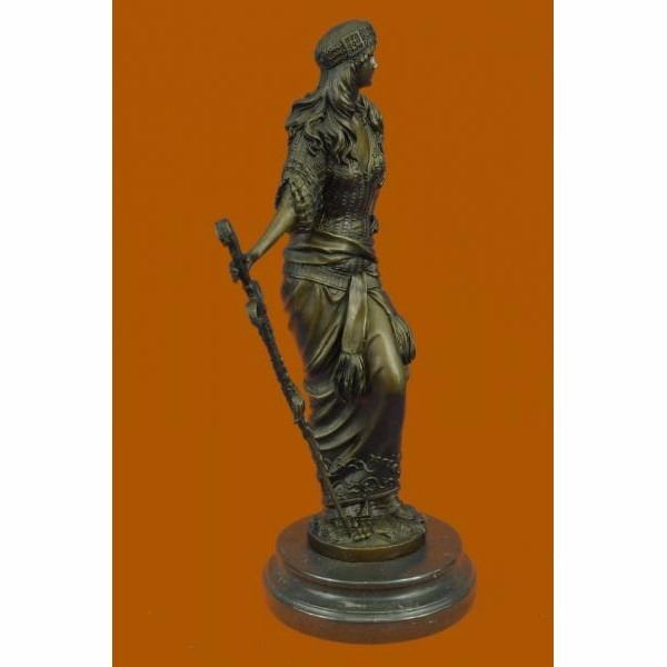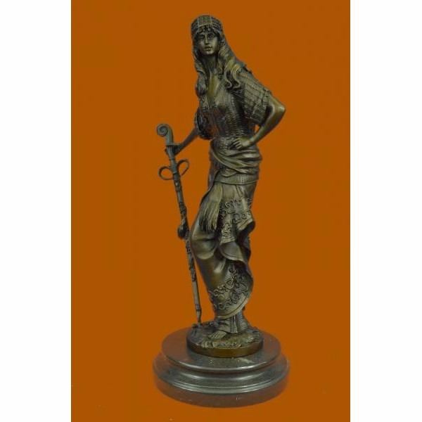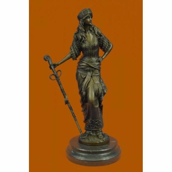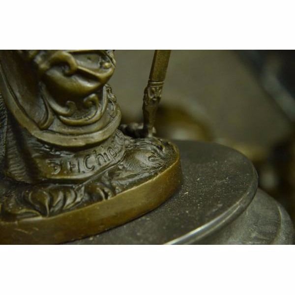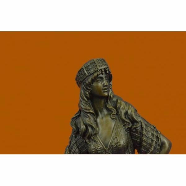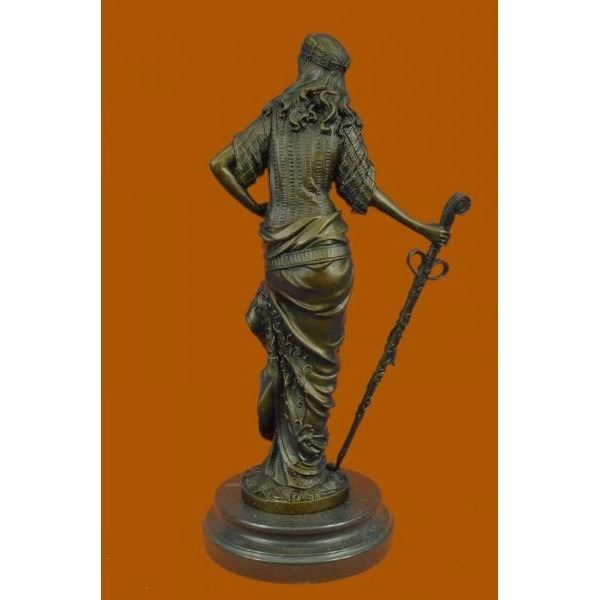 The bewitchingPersian Princessstands defiant and proud amongst the bustling crowd around her. She stands in a classical contrapposto position dressed in an attire with impeccable detail and realness. Her flowing wild hair is covered by a scarf with beads along the hem. Her right arm holds on to a sword used for traveling the many miles of land with her nomadic caravan family. She was captured using the age-old method of lost-wax casting and stained with a brown patina finish. She is mounted upon a black marble base with the artist Chiparus signature. Condition: This sculpture is in perfect condition. Bronze Dimensions with Marble Base:Height 15" x Width 8" Marble Dimensions:Diameter 6" Height without base: 14" Weight :10 LBS Inventory : 17YRD12425771