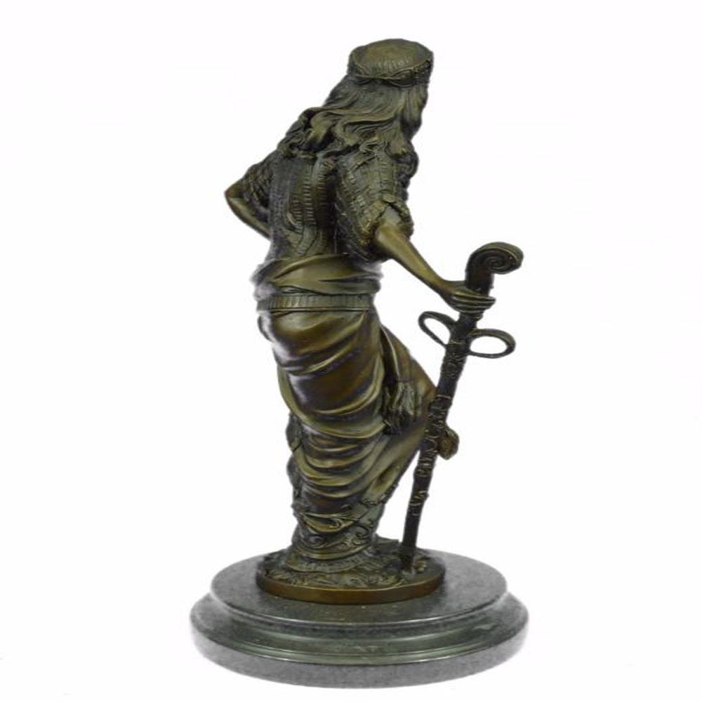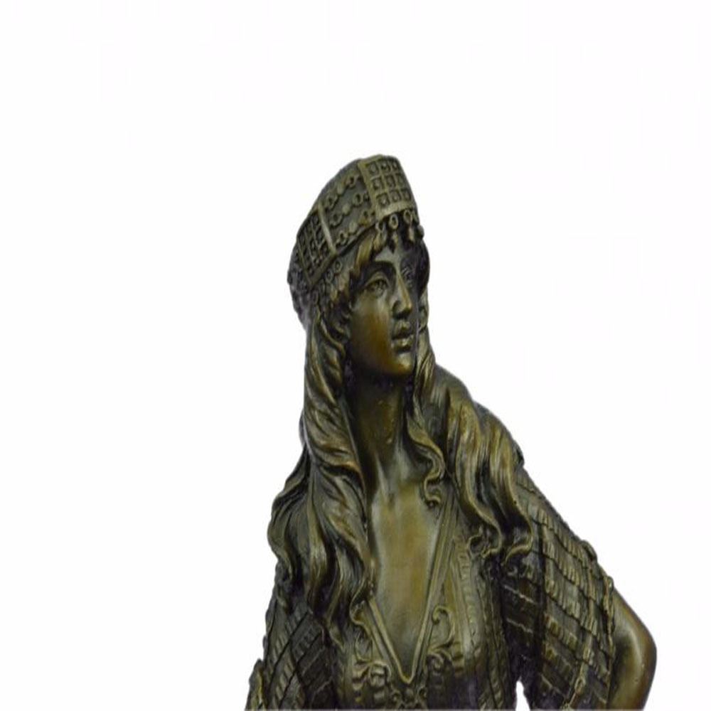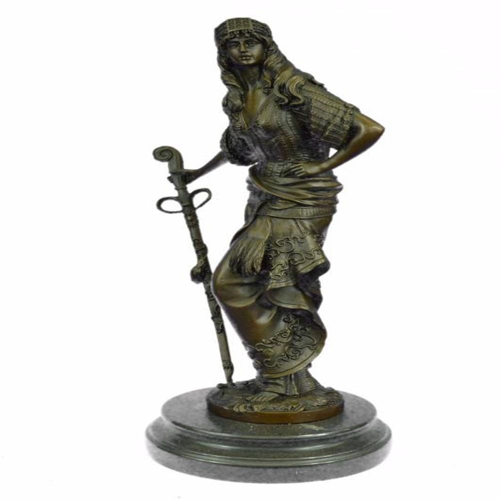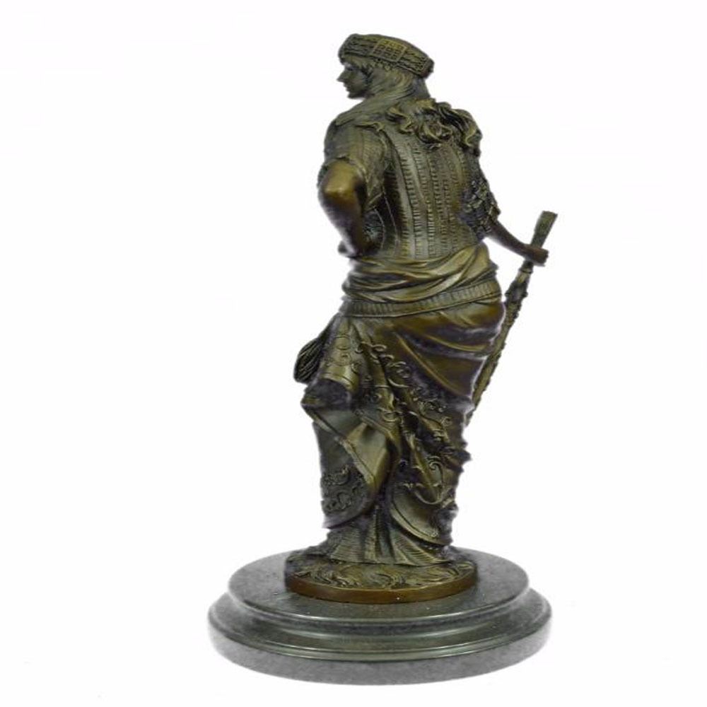 The bewitching Persian Princess stands defiant and proud among the bustling crowd around her. She stands in a classical contraption position dressed in attire with impeccable detail and realness. Her flowing wild hair is covered by a scarf with beads along the hem. Her right arm holds on to a sword used for traveling the many miles of land with her nomadic caravan family. She was captured using the age-old method of lost wax casting and stained with a brown patina finish and is mounted upon a marble base. Bronze Dimensions with Marble Base: Height 15 X Width 8 inches. Weight: 10 LBS.