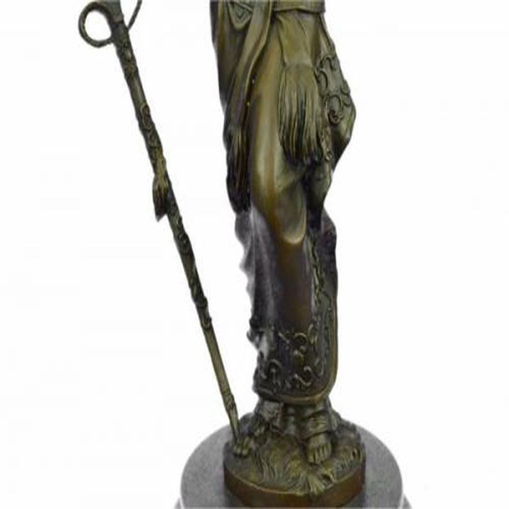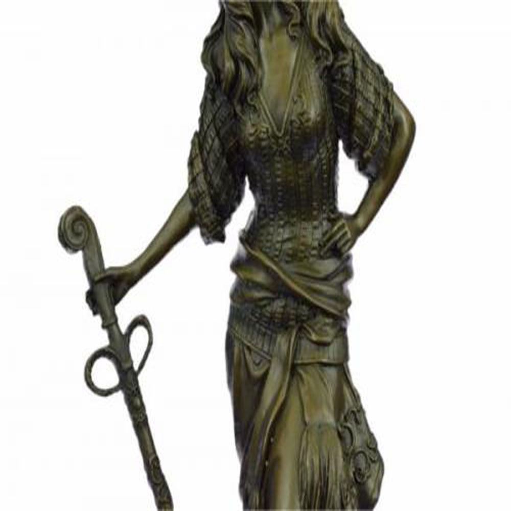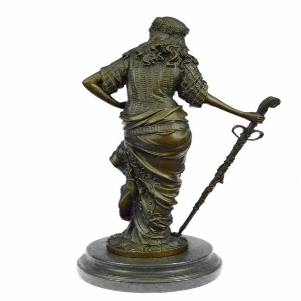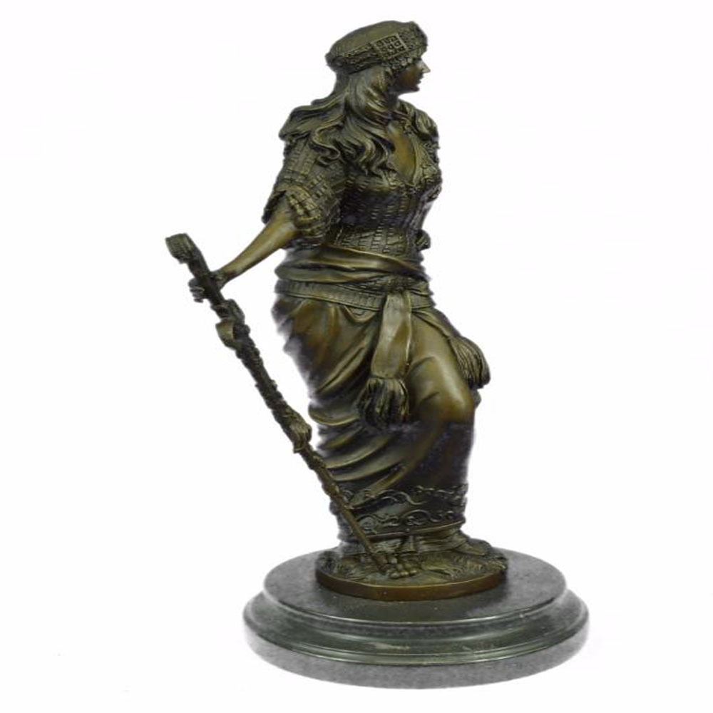 The bewitching Persian Princess stands defiant and proud among the bustling crowd around her. She stands in a classical contraption position dressed in attire with impeccable detail and realness. Her flowing wild hair is covered by a scarf with beads along the hem. Her right arm holds on to a sword used for traveling the many miles of land with her nomadic caravan family. She was captured using the age-old method of lost wax casting and stained with a brown patina finish and is mounted upon a marble base. Bronze Dimensions with Marble Base: Height 15 X Width 8 inches. Weight: 10 LBS.