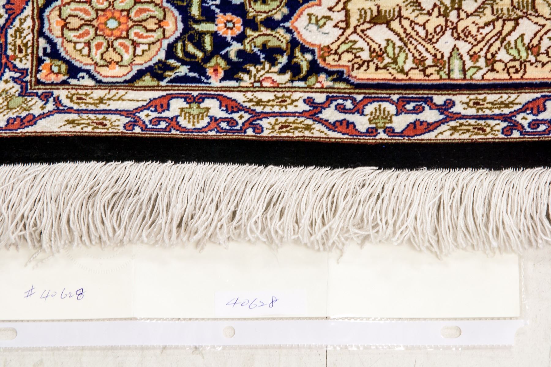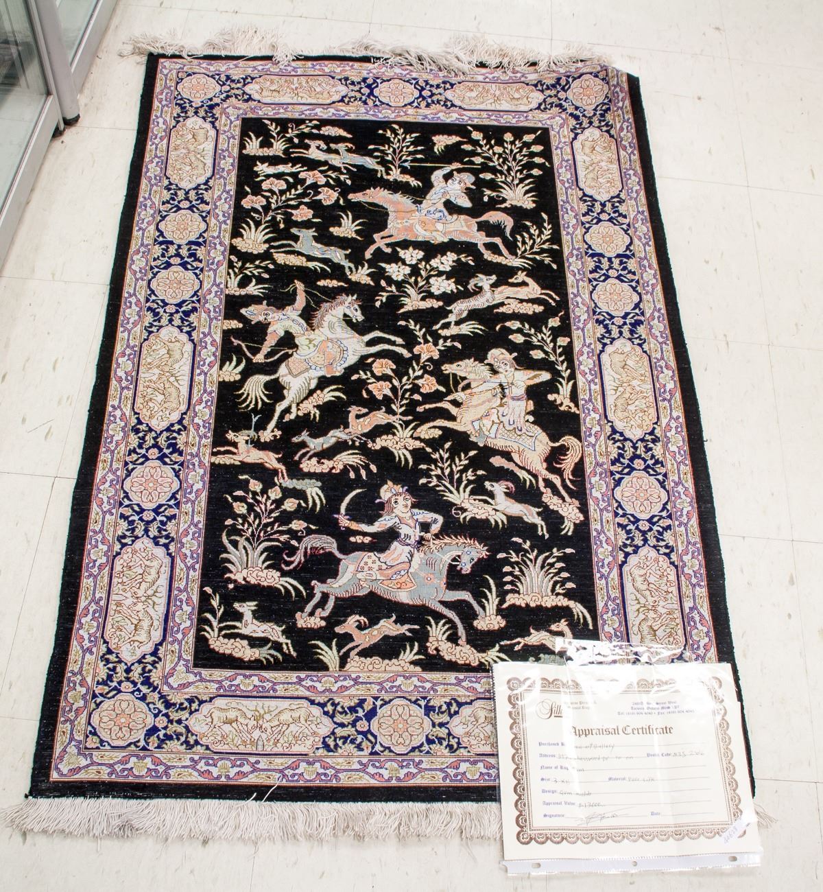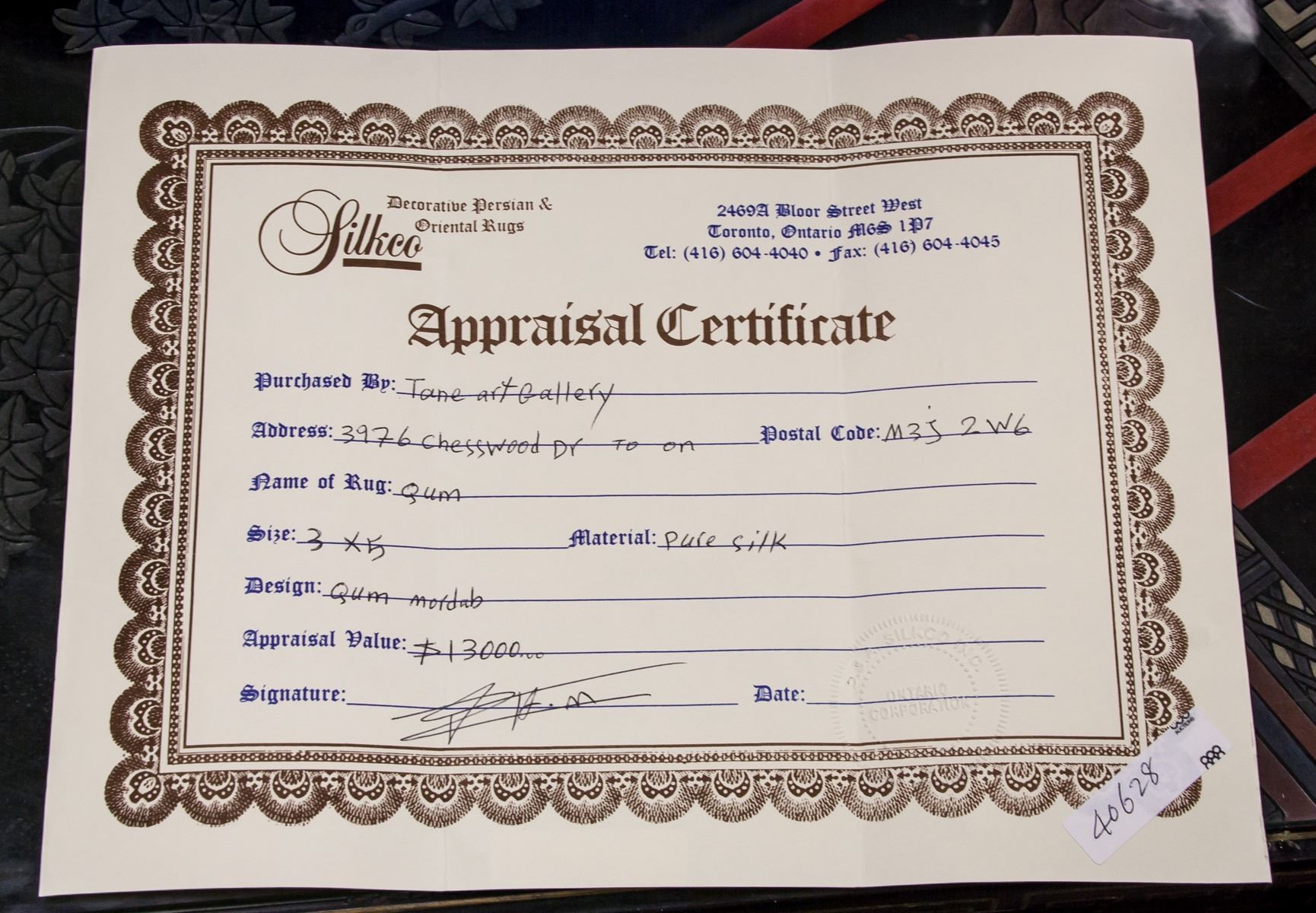 Persian silk rug, pure silk, designed by Qum Mardab, with appraisal certificate issued by Silkco Decorative Persian & Oriental Rugs, value $13,000 Canadian dollars, 3 x 5 feet (91.44 x 152.4 cm)