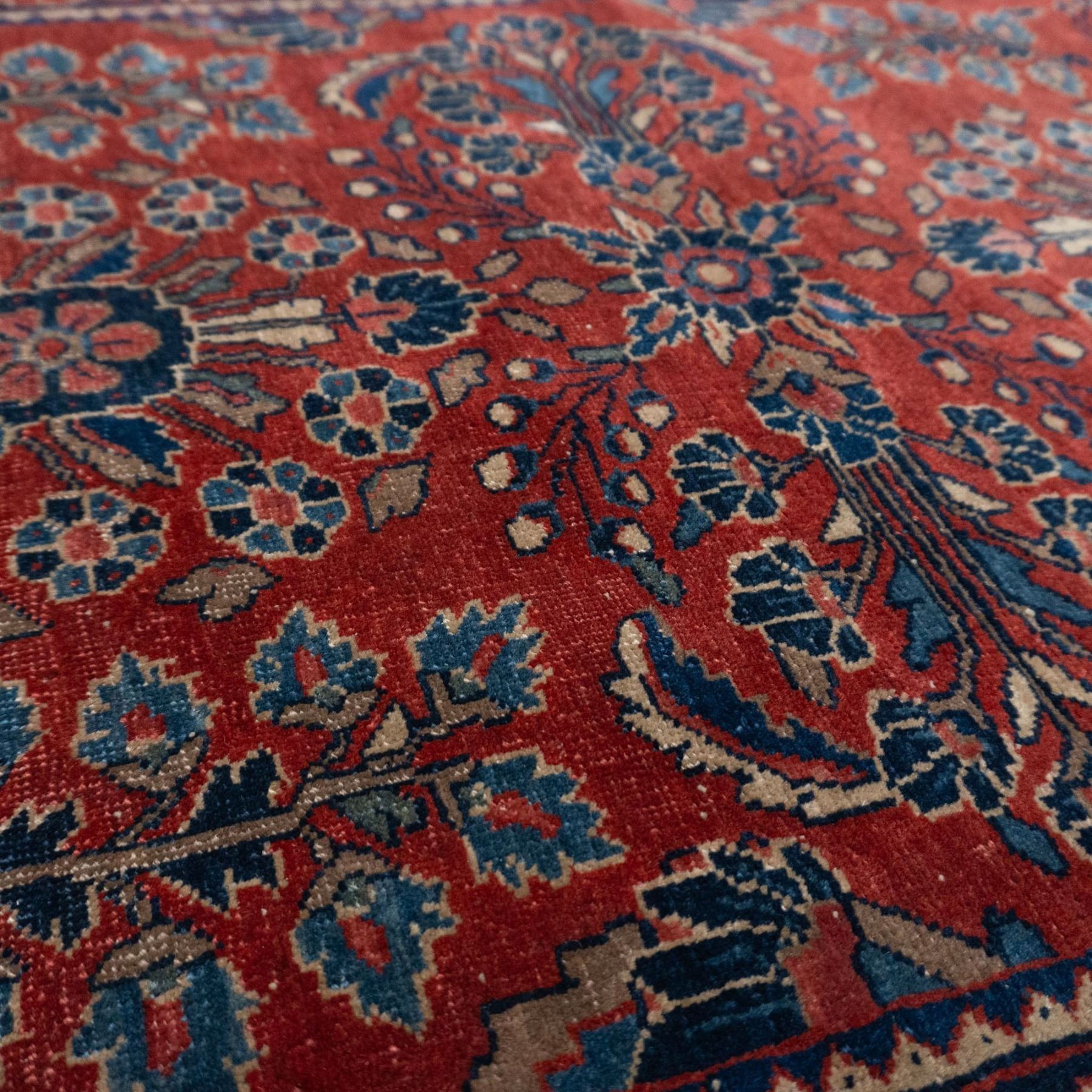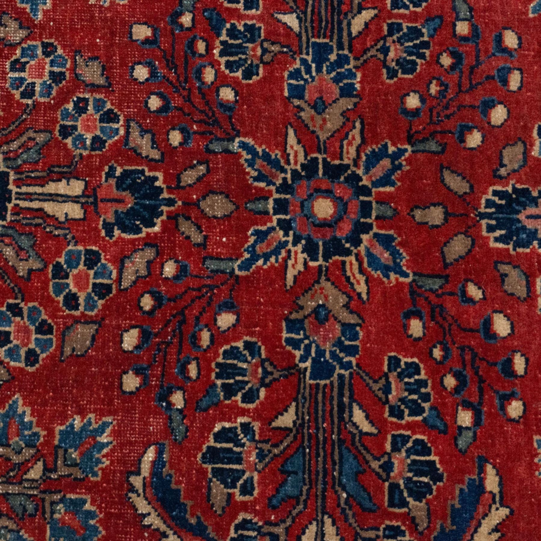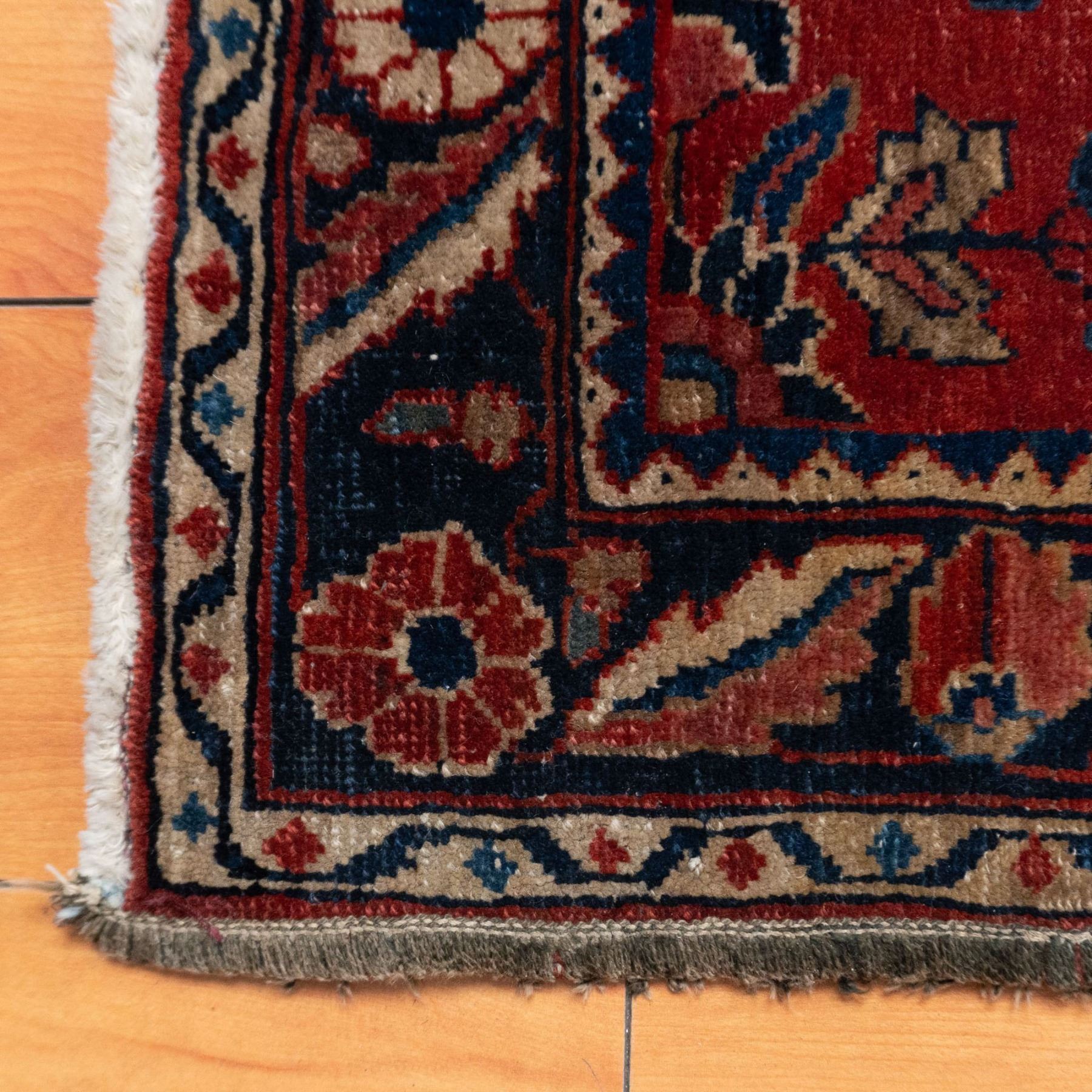 A rectangular red rug adorned with a blue border, featuring beautiful flowers scattered throughout the design in shades of red, blue, and white.