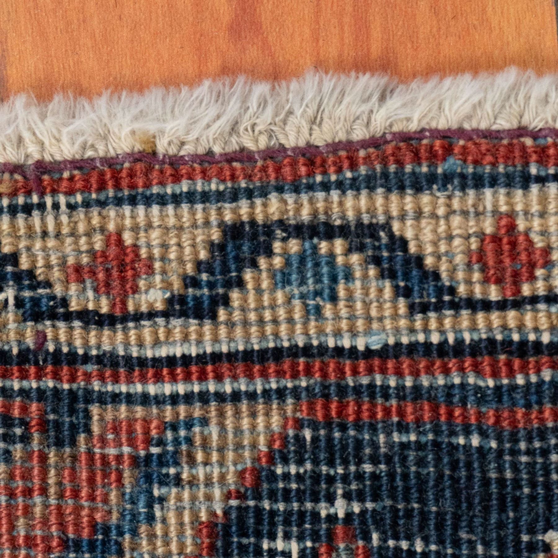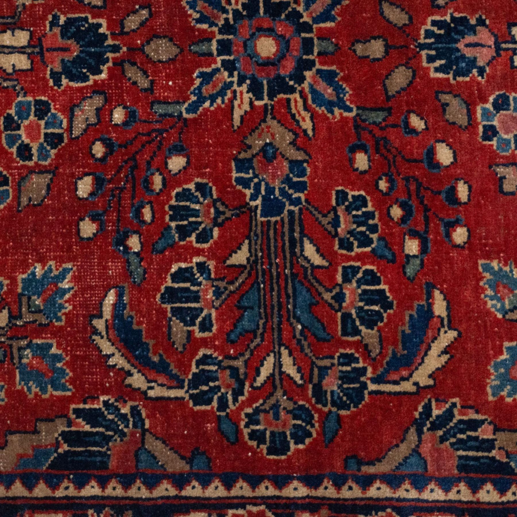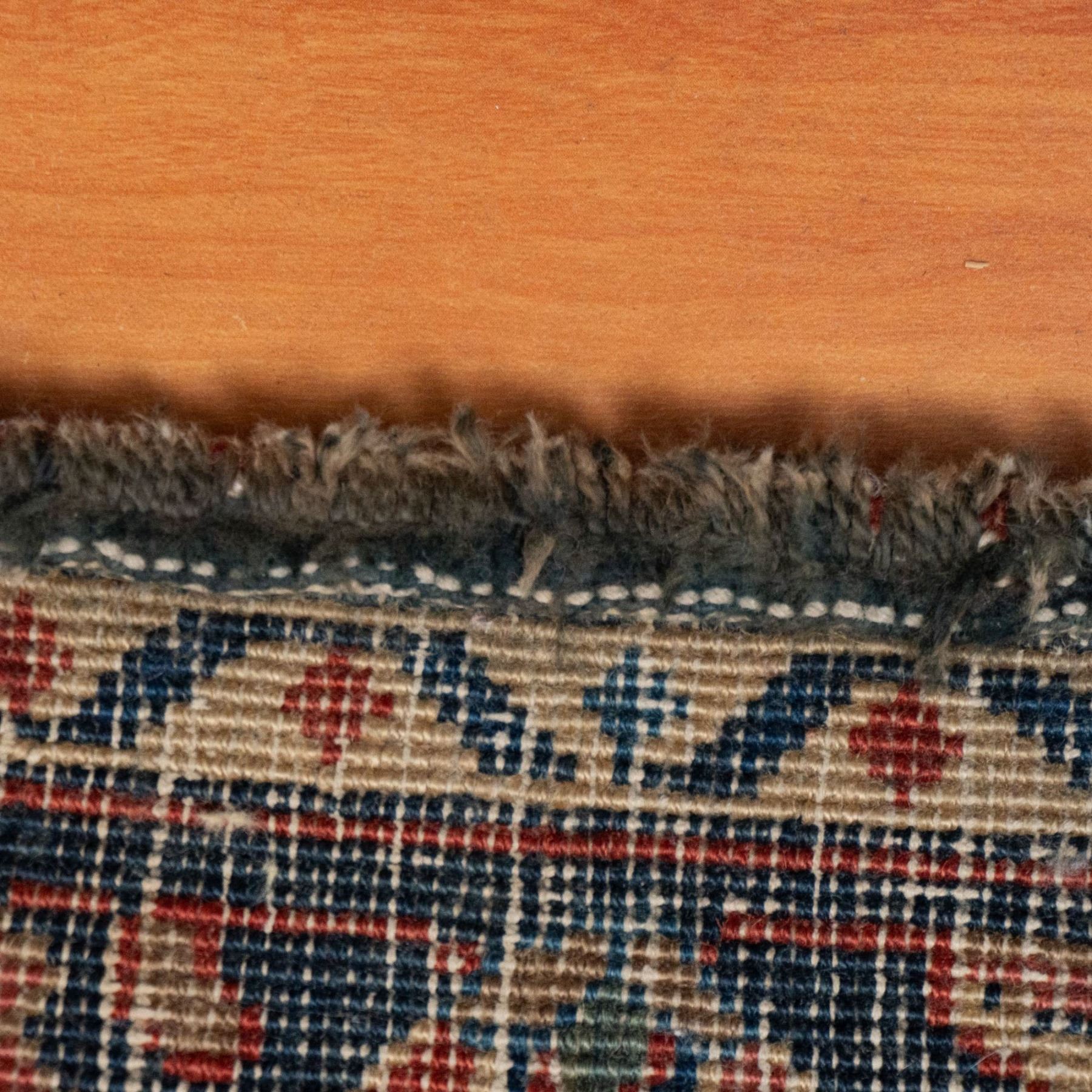 A rectangular red rug adorned with a blue border, featuring beautiful flowers scattered throughout the design in shades of red, blue, and white.