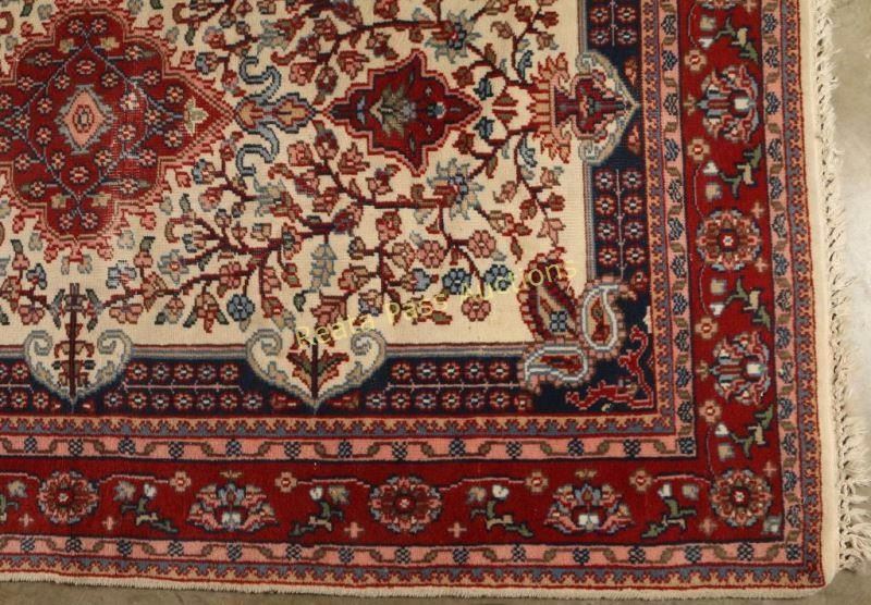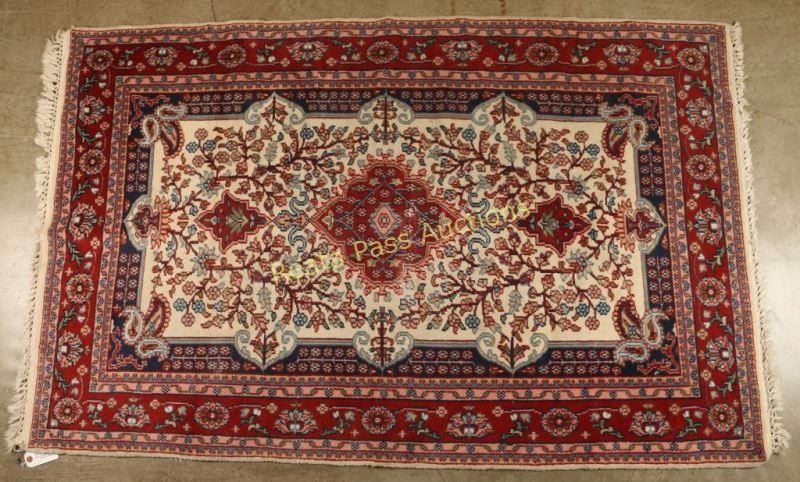 Jaipur Tarriz hand knotted wool rug with a red base with blues, pinks and cream. Measures 45"x6'.