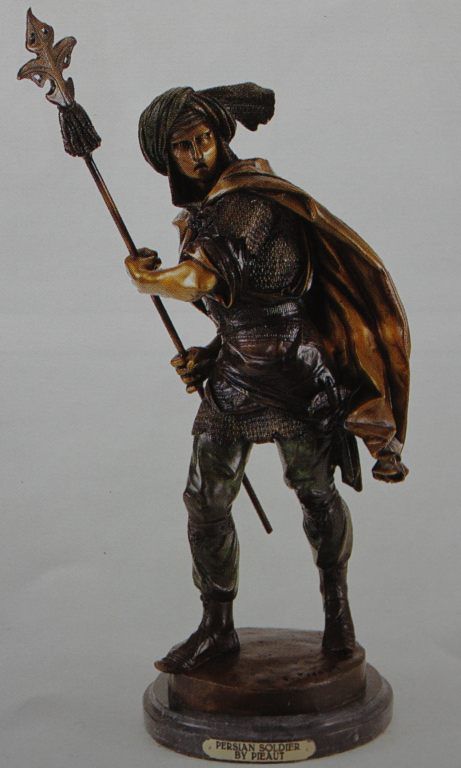 "Persian Soldier" Bronze Sculpture - After Pieaut - Beautiful Color Patina - Mounted On A Fine Italian Marble Base - Beautifully Detailed - Signed - Mint Condition - 20"H X 10"W - Lost Wax Cast Bronze