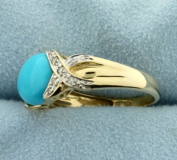 In 14k yellow gold. Contains a beautiful natural Persian 11x9mm turquoise gemstone with vivid color and no matrix. Also contains fourteen high quality 1/2 pt round diamonds. Size 8 1/2. 4.1g.