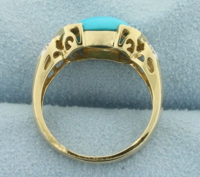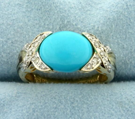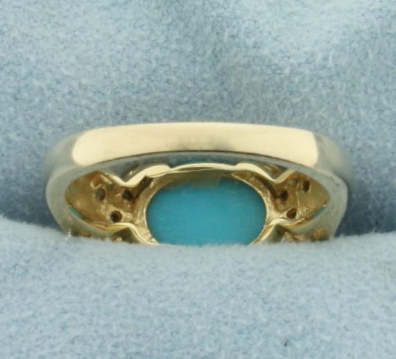 In 14k yellow gold. Contains a beautiful natural Persian 11x9mm turquoise gemstone with vivid color and no matrix. Also contains fourteen high quality 1/2 pt round diamonds. Size 8 1/2. 4.1g.