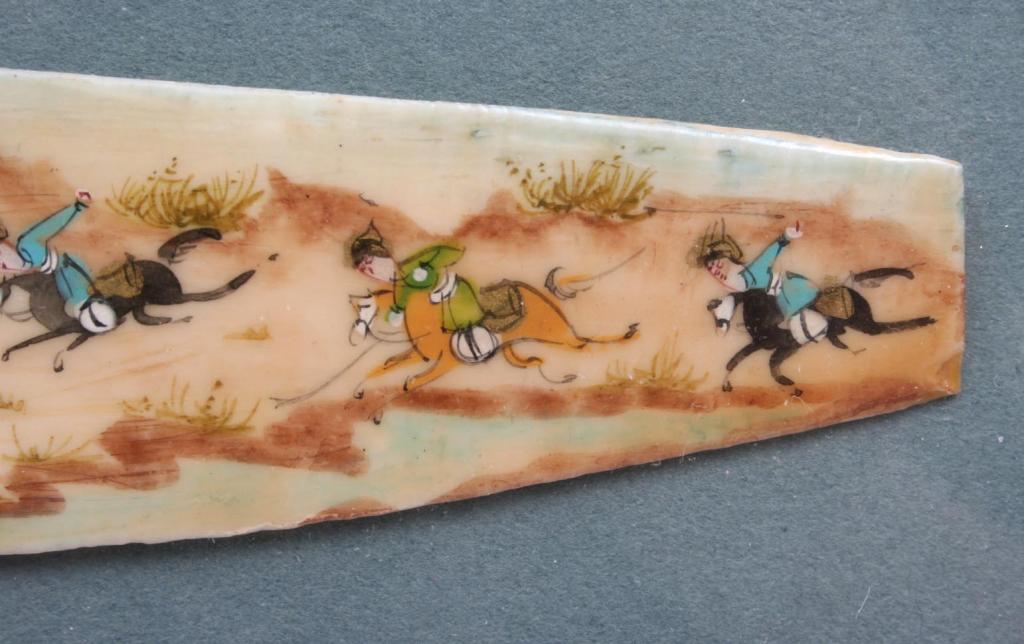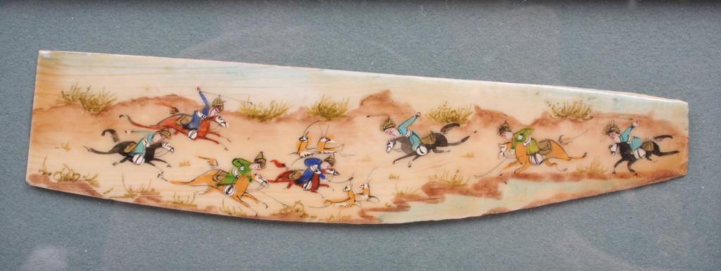 20th century, the bone fragment painted in polychrome with a hunt scene, with riders on horse back chasing their quarry, matted and framed. 5 1/2" x 9 1/2" (framed dimension). Condition: excellent, not examined out of frame.