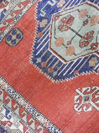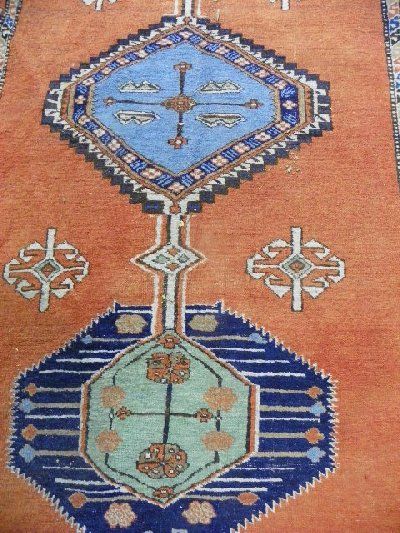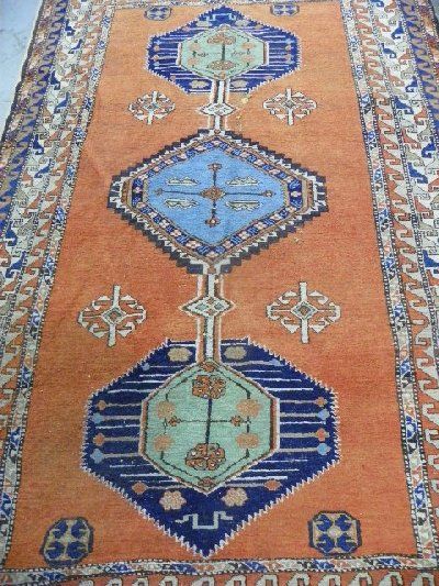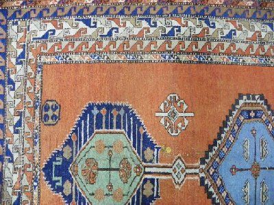 Orange, blue & beige. Approx. 5' x 8'. Please read our terms of sale.