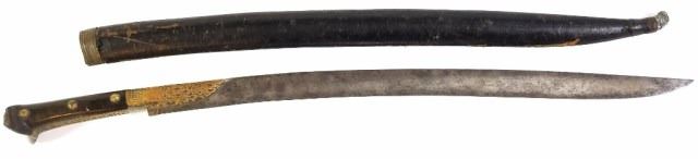 and horn grip. Blade 21 1/2" with some engraving, brass furniture, overall nice sword, unsharpened. Shows moderate chips to both sides of heel. Est. 150-275