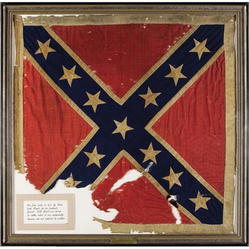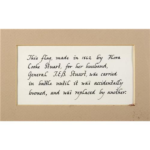 <B>The Personal Battle Flag of Confederate General JEB Stuart, The Most Famous Cavalry Officer of the Civil War.</B></I> General James Ewell Brown (JEB) Stuart was the most famous, daring and flamboyant cavalry commander in the Civil War. This battle flag was carried by Stuart in the Civil War. It is made of a red bunting field, 34" square, with a white border on all four sides. The centered, blue "Saint Andrew's Cross" is trimmed in white as well and incorporates the 13-star design. The most recognizable banner of the Confederacy, this design, approved by Generals Pierre G. T. Beauregard and Joseph Johnston, originally called for flags of different sizes to be issued to the infantry, cavalry, and artillery. However, in practice, the flags were issued to units based on availability with no regard to protocol. One of this historic flag's significant attributes lies in the fact that it was hand-sewn by General Stuart's wife Flora. <BR><BR>In the tradition of Betsy Ross of "Old Glory" Revolutionary War fame, many women of the Confederacy sent their husbands and sons off to war with beautiful hand-sewn battle flags. A hand-sewn Revolutionary War flag carried by General George Washington's cavalry recently sold at auction for $12 million, lending speculation as to the market value of this most important flag of the Civil War. Adding to the historical significance of this flag, Stuart actually sent the flag home to his wife since it had fallen in a campfire. His apologetic note to Flora details the accident: "<I>My Darling One - My battleflag - the beautiful one you made fell from the tent front the other day into the fire... It has proudly waved over many battlefields and if ever I needed a motive for braving danger and trials I found it by looking upon that symbol placed in my hands by my cherished wife...Yours ever JEB Stuart</B></I>". <BR><BR>Although the fire-singed corner of the flag is still evident, professional conservators have labored over it to ensure that the flag is preserved for generations to come. The most famous cavalier of all Civil War cavalrymen personally carried it; a dynamic general with a plumed hat and cape, JEB Stuart was the epitome of a military icon. His last battle was at Yellow Tavern, Virginia where he suffered a mortal wound, dying at Richmond the next day, his beloved Flora tragically arriving just hours after his death on May 12, 1864. <BR><BR>JEB Stuart was already a prominent military officer by the time he became famous during the Civil War. Attaining the rank of major general in the Confederate army within 15 months of resigning his Union army commission to join forces with his native Virginia and the South, Stuart came from a long and patriotic line of Scots-Irish Virginians. Descended from Revolutionary War patriots who fought at Yorktown and Guilford Courthouse, JEB Stuart was born February 6, 1833 at Laurel Hill Plantation, Patrick County, Virginia. The youngest son of Archibald and Elizabeth Letcher Pannill Stuart, JEB's father was a respected attorney and politician having served in both houses of Virginia's General Assembly and one term in the United States House of Representatives. <BR><BR>At the age of 14 JEB enrolled at Wytheville School and later attended Emory and Henry College. But Stuart's heart, and legacy, was to be found in the military. He entered the United States Military Academy at West Point in 1850, graduating four years later (Class of 1854) thirteenth in a class of forty-six. A later comrade and subordinate, Confederate General Fitzhugh Lee (Class of 1856) remembered JEB while at West Point fondly: "I recall his distinguishing characteristics which were a strict attention to military duties... an immediate and almost thankful acceptance of a challenge to fight, from any cadet who might in any way feel himself aggrieved, and a clear, metallic, ringing voice." <BR><BR>Fitzhugh Lee, nephew of Robert E. Lee, would be assigned to JEB's 1st Virginia Cavalry at the start of the Civil War. But JEB had seen much action between his West Point years and the start of the Civil War in 1861. He was commissioned a brevet second lieutenant in the regiment of mounted riflemen and assigned to the wild untamed Texas frontier right after graduation from West Point. A year later he was transferred to Fort Leavenworth, Kansas with the First Regiment, United States Cavalry to subdue hostile Indians. He would later be wounded at the Battle of Solomon's Creek, fighting the Cheyenne Indians. <BR><BR>Just two months later JEB would meet the love of his life, Flora Cooke, daughter of the Ft. Riley commander Colonel (and future Union Army Major-General) Philip St. George Cooke. Married in November 1855, Flora would be a loving and doting wife throughout their too-short marriage, eventually seeing him off to battle with the hand-sewn battle flag offered here. Two years later Stuart received a 6-month leave of absence to travel to Washington, DC to patent a saber attachment he had invented, seeking to sell the device to the War Department. <BR><BR>It was on that occasion in 1859 when Stuart would almost incidentally take part in an historical episode that was to be played out at Harper's Ferry, Virginia. While in Washington, DC he carried secret instructions to (then) Union Army Colonel Robert E. Lee, orders directing Lee to put down an anti-slavery rebellion at Harper's Ferry, Virginia. Lee had been superintendent at West Point while Stuart was a cadet and Lee requested that Stuart accompany him on the mission. Upon their arrival Stuart and Lee found that a party led by a man known only as "Smith" had led a raid into the little town, seizing an undefended armory, arsenal and rifle works. Subsequently flushed from the armory and into a firehouse, the group barricaded themselves in and waited. Stuart was ordered to take the building and subdue "Smith" and his 21 recruits on October 18, 1859, killing two raiders and capturing the others. <BR><BR>Stuart immediate