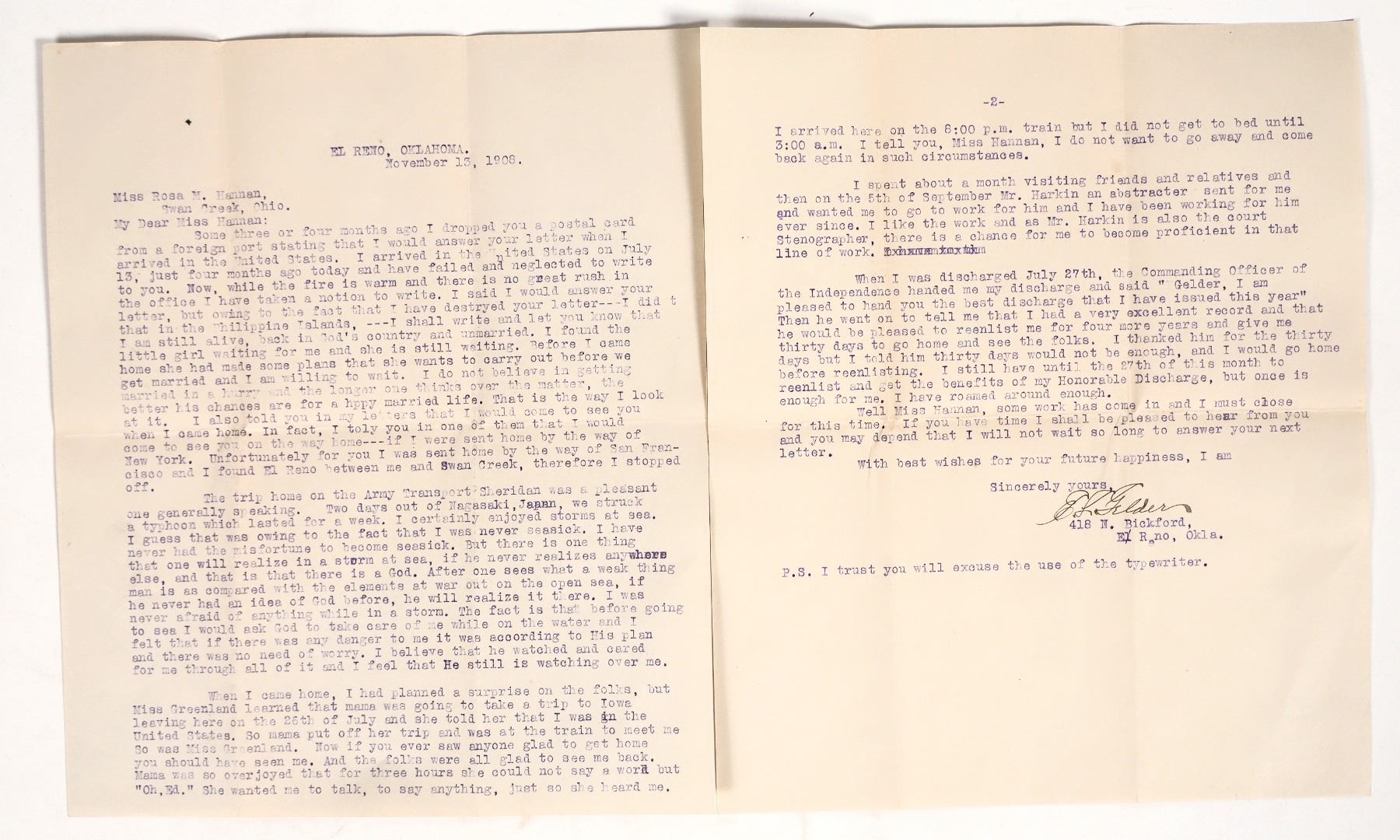 Personal Letter Regarding the Discharge of EL Gelder to Miss Rosa Haman dated 1908. Regarding his trip to Japan from the Philippines and going through a Typhoon