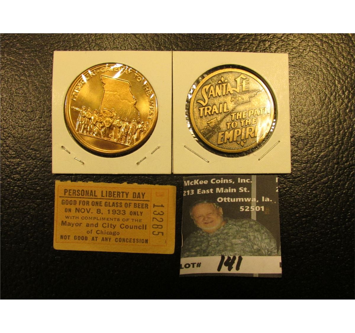 "Personal Liberty Day Good For One Glass of Beer on Nov. 8, 1933 only with Compliments of the Mayor and City Council of Chicago…", "Ansell-Simplex Ticket Co. Chicago"; Bronze Missouri Sesquicentennial Medal; & Brass Kansas Centennial Medal, both BU.