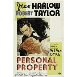 <B>Personal Property (MGM, 1937)</B></I> One Sheet (27" X 41") Style C. Jean Harlow and Robert Taylor star in this light-hearted romance about a man on the run from the law who gets a job watching the "personal property" of a gorgeous widow. There are two small tears in the upper border of this poster that don't detract from its overall beauty. We doubt you'd find a cleaner copy! Very Fine+.