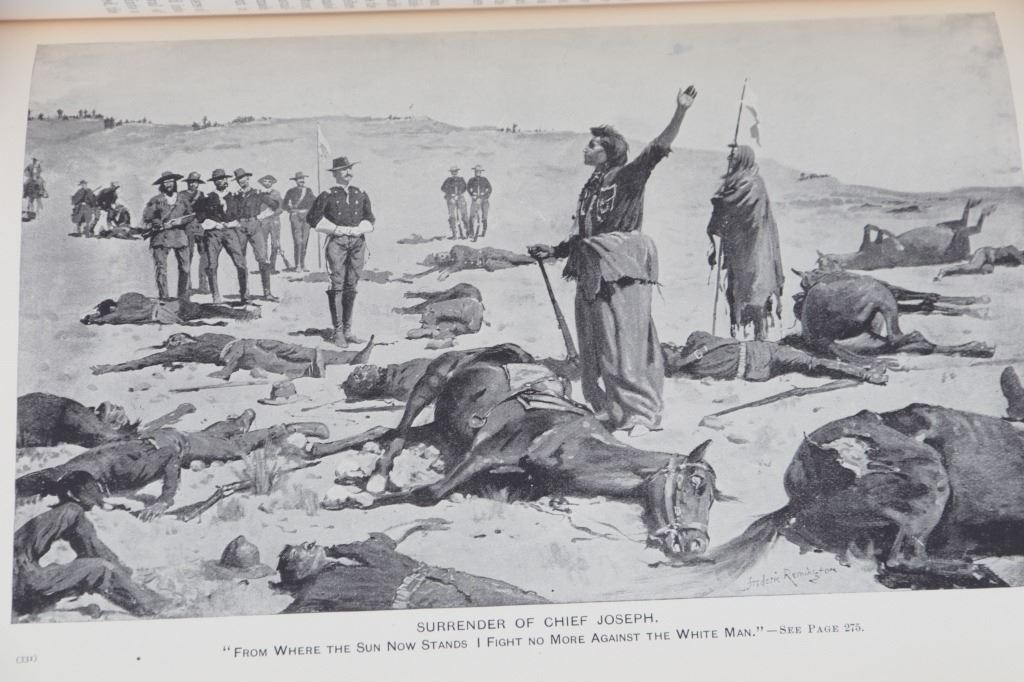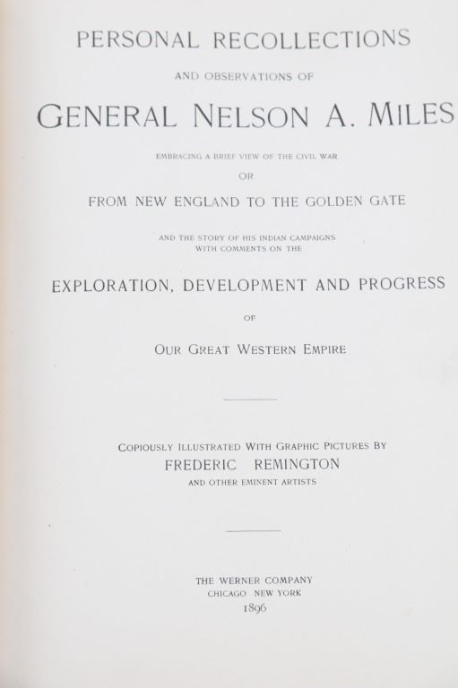 Offered in this lot is an 1896 first edition printing of "Personal Recollections and Observations of General Nelson A. Miles" with illustrations from Frederic Remington. General Nelson A. Miles served his country with distinction for forty-two years. During the Civil War, he fought in many important battles of the Army of the Potomac, and by the end of the war was made the rank of major general of volunteers. In 1869, Miles was transferred to the West, where he achieved his greatest fame fighting against the American Indians. This memoir is filled with historical figures and illustrated by Frederic Remington. The book is in good condition, with wear on the corners of the binding and edges as expected. The book measures 10" x 7 3/4".