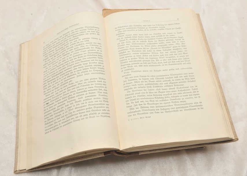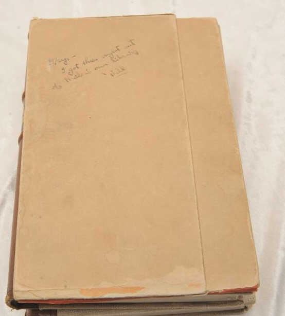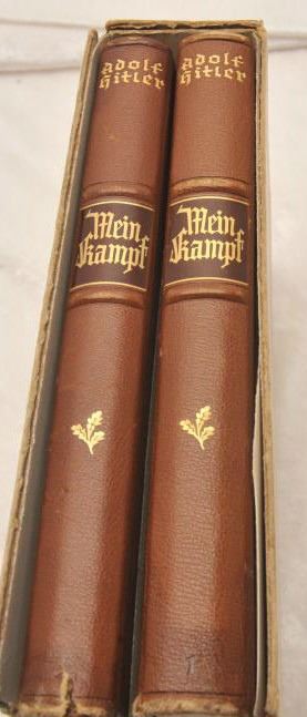 Personal set (2 volume deluxe edition) “Mein Kampf” with documentation as being found by Willbert (Bill) Massman in the Prinze Regent Platz Hotel Munich which was Hitler’s residence when in Munich. Notarized documentdated March 13, 1995 states Massman was assigned to Co. D 179th Inf. Reg., 45 Div., 7th Army, and he took the books from Hitler’s office. Also stated Massman was a special service interrogator. Copy of article datedWednesday May 14, 1986 in “The Daily Herald” United Pres International described the two edition along with other artifacts Massman liberated and sold to the Seven Acres Military Museum in Union, Illinois. Listed as lot #900 in the sale of this military museum on Monday, Aug 21, 1995. The condition of the books is near fine with cardboard original cover inscribed to Mary by Massman stating “I got these right out of Hitler’slibrary, Bill”. And inscribed to his wife Mary as he sent them to her. “Hitler’s personal library sticker is glued inside volume 1’s inside cover. Note: Little John’s in no way endorses or seeks to engrandize the