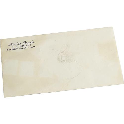 <B>Personalized Envelope with Strands of Brando's Hair.</B></I> A small white envelope with Brando's name and Beverly Hills mailing address, containing several strands of the Brando's hair. The envelope is in Excellent condition with some areas of moderate discoloration. <I>From the collection of Marlon Brando.</B></I><BR><BR><b>Shipping:</b> Flat Material, Small (<a target="_blank" href="http://www.heritageauctions.com/common/shipping.php">view shipping information</a>)