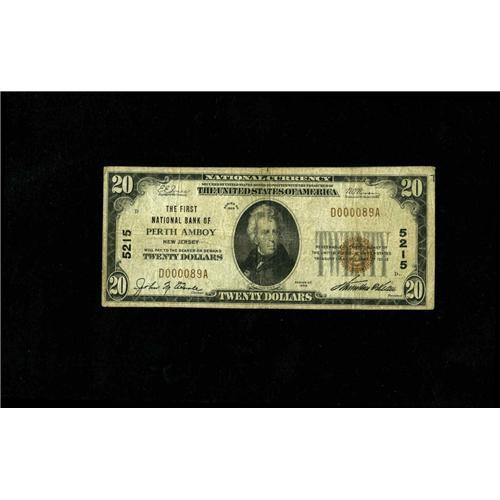 <B>Perth Amboy, NJ</B></I> - $20 1929 Ty. 1 <B>The First NB </B></I> Ch. # 5215<BR>Here is one of three Type 1 $20's recorded on the bank, as no Type 2 examples are presently known. Two apparent staple holes are found at center, in Jackson's lapel. <B>Fine.</B></I>
