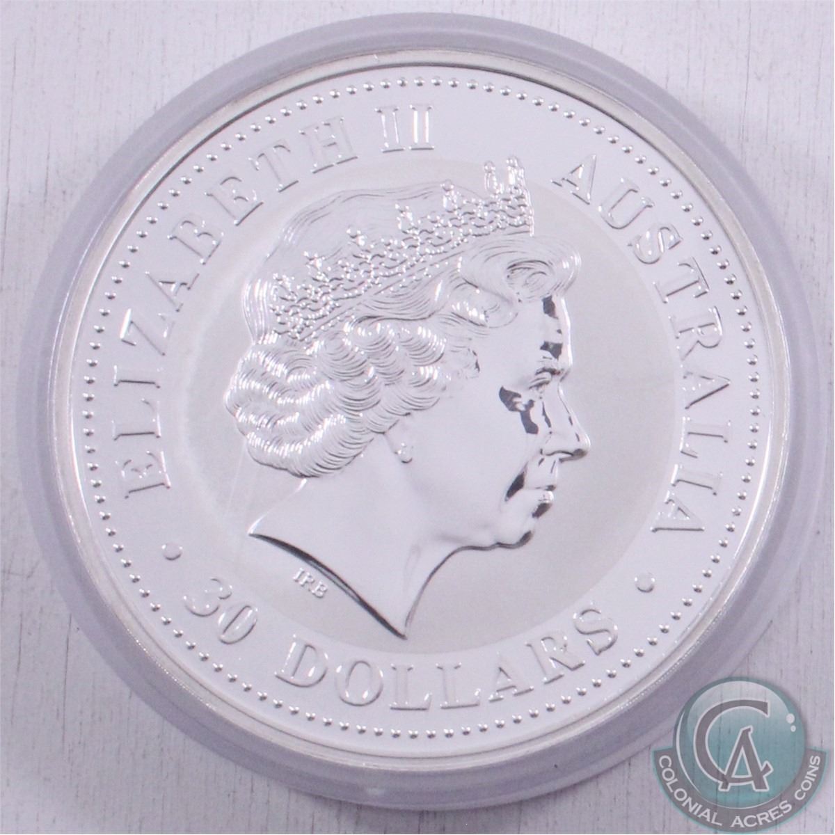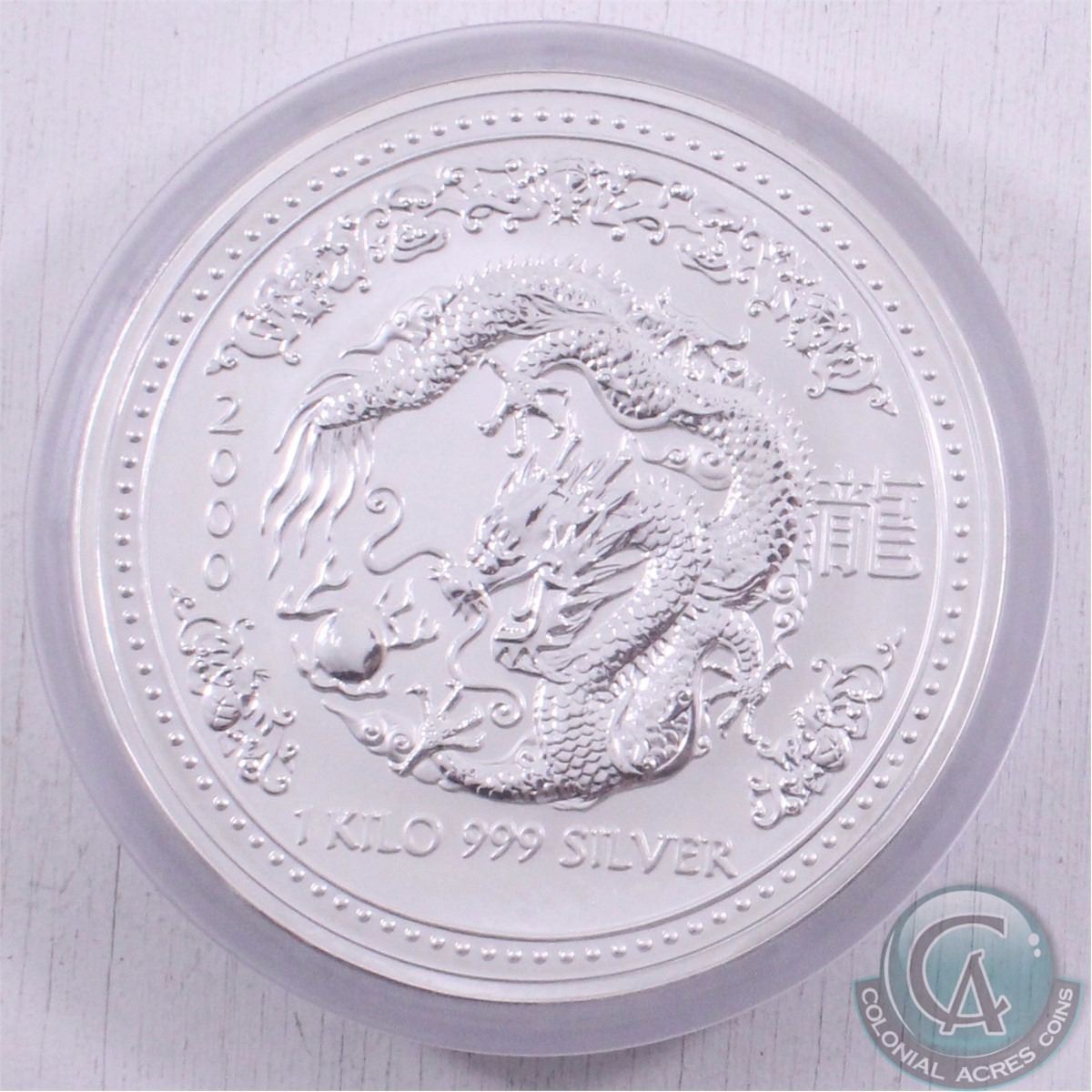 Perth Mint Issue: 2000 Australia Kilo (32.15oz.) .999 Fine Silver Year of the Dragon Silver Coin (TAX Exempt) - capsule is lightly scuffed, coin is fine.