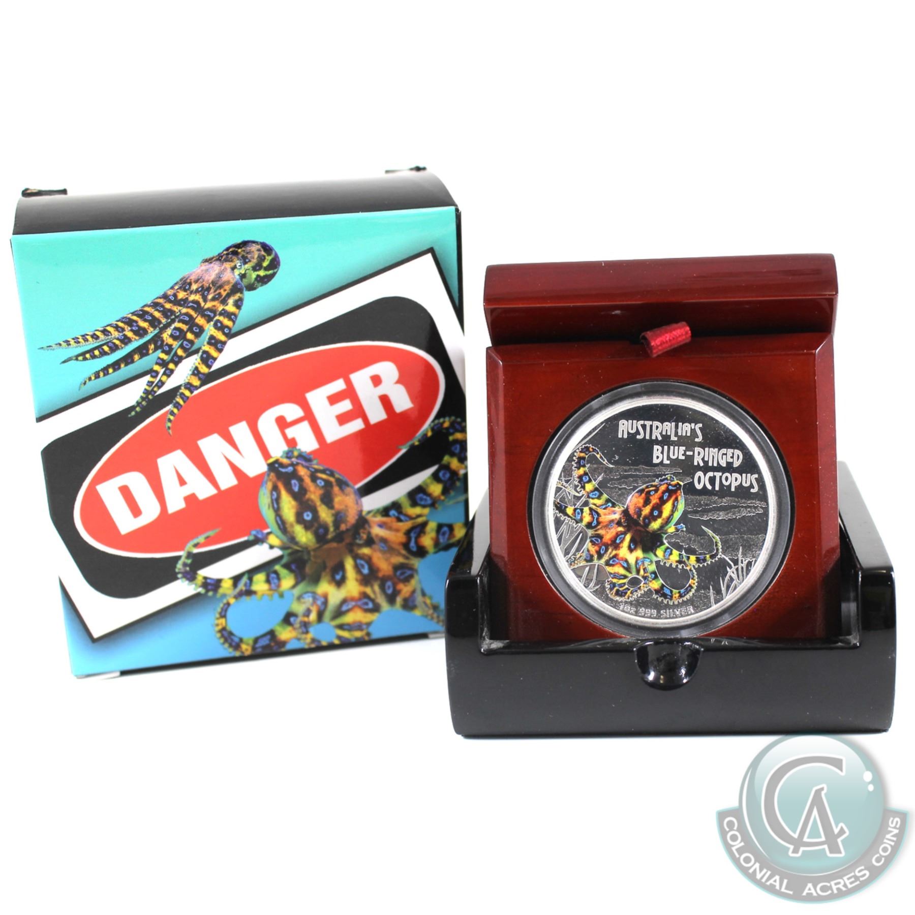 Perth Mint Issue: 2008 Tuvalu $1 Blue-Ringed Octopus Fine Silver Coin (Capsule lightly scratched) Tax Exempt.