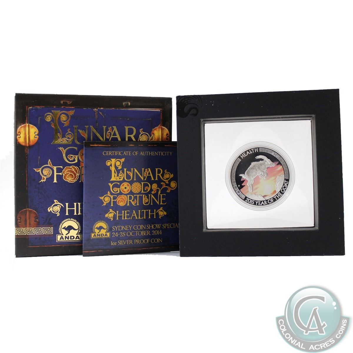 Perth Mint Issue: 2015 Tuvalu Lunar Good Fortune ANDA Coin Show Special - Year of the Goat Health 1oz .999 Fine Silver Proof Coloured Coin (TAX Exempt)