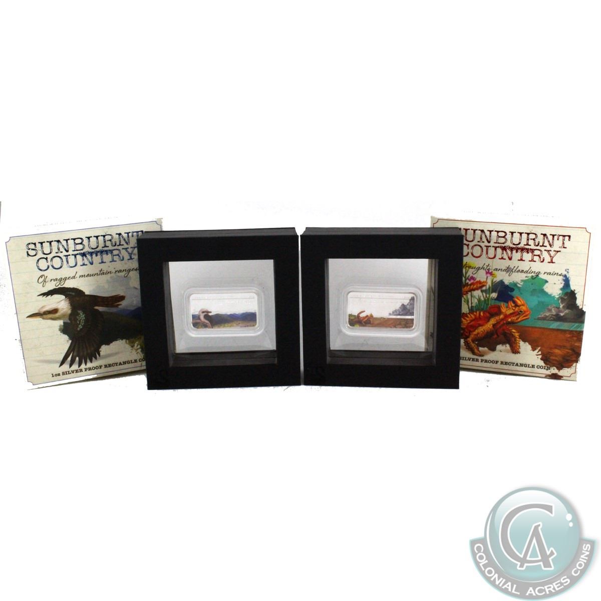 Perth Mint Issue: 2x 2015 Sunburnt Country Series 1oz .9999 Fine Silver Coins. This lot includes the: 2015 Australia Sunburnt Country - Of Droughts and Flooding Rains 1 oz 99.99% Silver Proof Rectangle Coin and the 2015 Australia Sunburnt County of Ragged Mountain Ranges 1 oz. Silver Proof Rectangle Coin. 2pcs (TAX Exempt)