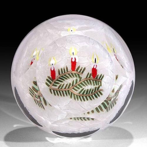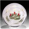 Perthshire Paperweights 1999 Christmas paperweight, with three red candles on a pine branch, over white upset muslin. Six and one facets. Signature/date cane. Edition # 78 of a limited edition of 200. Diameter 2 3/4".