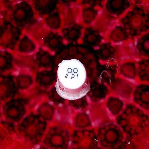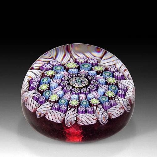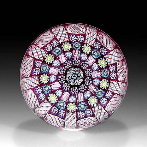 Perthshire Paperweights 2001 cartwheel design millefiori paperweight. The piece contains several concentric rings of complex millefiori, around a large complex cane center. In two of the rings, the canes alternate with short segments of white latticinio. Translucent color ground. Signature/date cane. Edition #66 of a limited edition 200. Diameter 2 1/2".