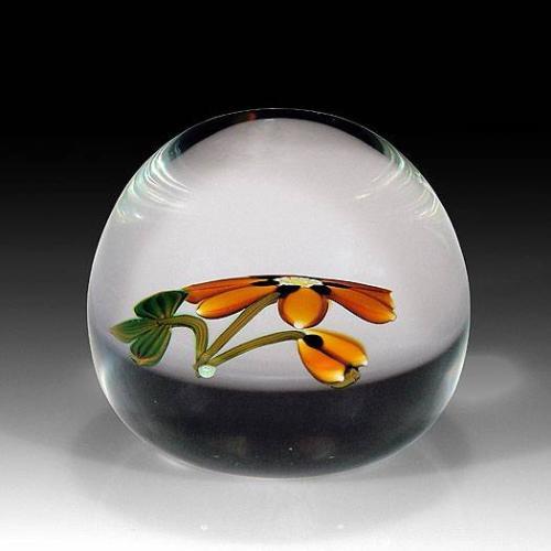 Perthshire Paperweights 2002 one-of-a-kind flower and bud miniature paperweight. The flower has six golden-yellow petals, around a complex star cane center, rimmed by black accents. It grows on a stem, with a yellow bud and green leaves, over clear ground. Signature cane. Diameter 2".