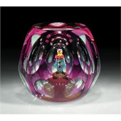 Perthshire Paperweights 1998 faceted "Jojo the Clown" paperweight, with a three-dimensional clown in a full clown suit, standing on a brown ball, in an amethyst flash overlay with a top facet and two rows of side facets. "P 1998" signature/date cane on base. LE of 175. Diameter 3 1/4". $1000-1500