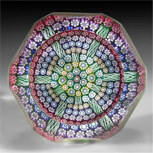 Perthshire Paperweights 2000 faceted patterned millefiori paperweight. A central pink and white cane is surrounded by two concentric rings of assorted canes, which are bordered by rows of canes separated by spaced radial white latticinio rods, on translucent green ground. A ring of pink complex canes encircles the border of the design. Six and one facets. Signature/date cane. Edition #95 of a limited edition of 200. Diameter 2 1/2".