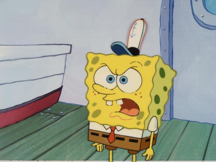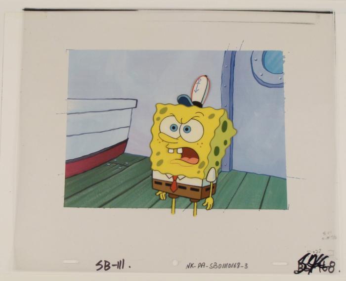 This original animation cel is from the Nickelodeon TV show SpongeBob Squarepants. The story takes place under the deep blue sea in Bikini Bottom, where SpongeBob resides. SpongeBob, who is a yellow, porous sponge, is your typical happy-go-lucky character, as he is always cheerful and enjoys making people laugh. Patrick Star, SpongeBob's Starfish neighbor, boasts knowing nothing and is often getting himself into ridiculous situations. Between the homes of these two lies the home of the miserable Squidward, a squid, who is known for being grouchy and playing tricks on SpongeBob and Patrick. Both SpongeBob and Squidward work at the Krusty Krab, a fast food business run by the greedy money-loving Mr. Krabs, a crab, the arch rival of the evil, possibly misunderstood, Plankton. Another neighbor, Sandy Cheeks, an athletic squirrel who normally wears an astronaut's space suit, was introduced in "Tea at the Treedome." She spends most of her time inventing and experimenting. In this cel SpongeBob is dressed in his Krusty Krab outfit, and he's yelling about something. Original Production Animated Cel Overall Size of Cel: 10 1/2" x 12 1/2" Excellent Condition; minor outline wearPrinted background copy, 11" x 17"Each one-of-a-kind set-up represents a slight change in position of the characters. When individually photographed and projected in rapid succession, the images appear to move.