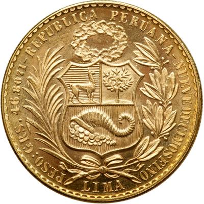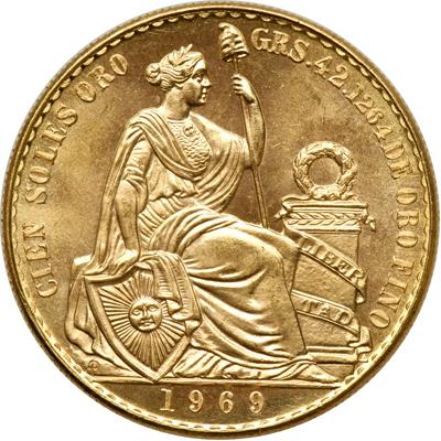 Peru. 100 Soles, 1969 (Lima). Fr-78; KM-231. Weight 1.3543 ounce. Liberty seated facing right. Reverse: Arms. Mintage 540 pieces. Rare date. NGC graded MS-66.
