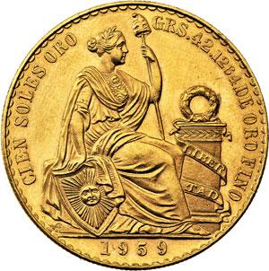 Monete e Medaglie Estere. Peru'. 100 soles 1959. Fr. 78. AU. g. 46.81 Colpetto sul ciglio del D/, altrimenti qFDC/FDC. Titolo 900/000.