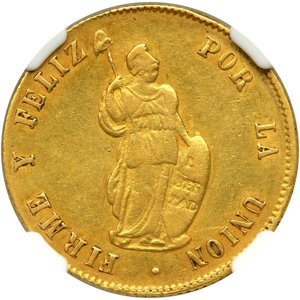 Peru. 2 Escudos, 1853-MB (Lima). Fr-65; KM-149.2. Weight 0.1927 ounce. Liberty standing holding shield and pole. Reverse: Arms. NGC graded VF-30.