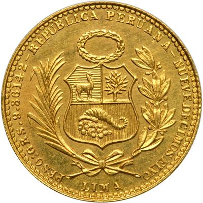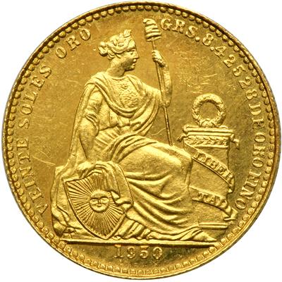 Peru. 20 Soles, 1950 (Lima). Fr-80; KM-229. Weight 0.2709 ounce. Liberty seated facing right. Reverse: Arms. Mintage 1,800 pieces. Scarce first date of issue. NGC graded MS-64.
