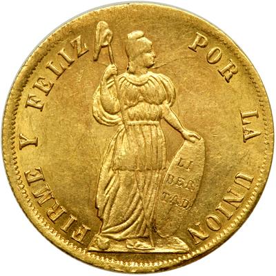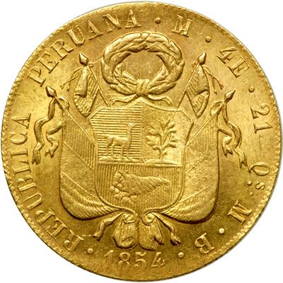 Peru. 4 Escudos, 1854- MB (Lima). Fr-64; KM-150.3. Liberty standing holding shield and pole. Reverse: Arms. Lustrous and scarce in grade. NGC graded MS-61.