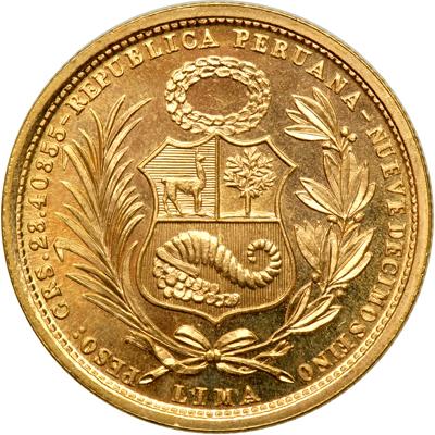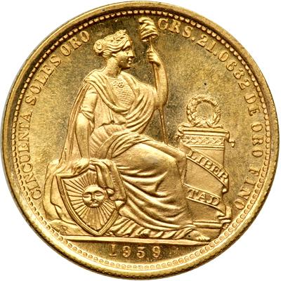 Peru. 50 Soles, 1959. Fr-79; KM-230. Weight 0.6772 ounces. Liberty seated left. Reverse: National arms. NGC graded MS-63.