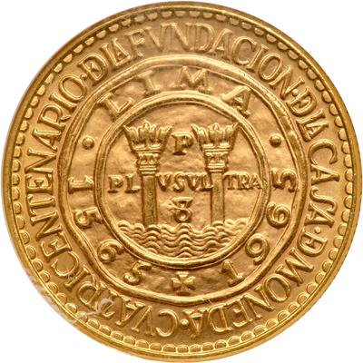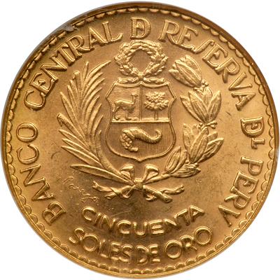 Peru. 50 Soles, 1965. Fr-84; KM-242. Weight 0.6772 ounces. 400th Anniversary of Lima Mint. One year type. NGC graded MS-65.