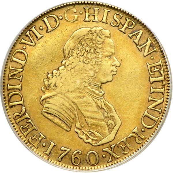 Peru. 8 Escudos, 1760-JM (Lima). Fr-20; KM-59.2. Fernando VI, 1746-1760. Smaller bust right. Reverse: Small crowned Bourbon arms within chain of the Order of the Golden Fleece. PCGS graded VF-35.