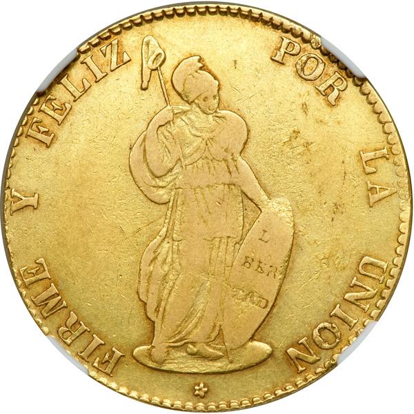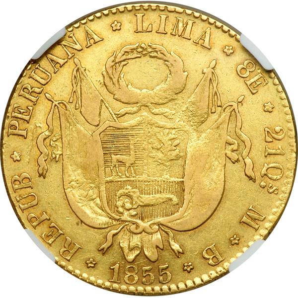 Peru. 8 Escudos, 1855-MB (Lima). Fr-62; KM-148.5. Weight 0.7595 ounce. Liberty standing. NGC graded VF-35.