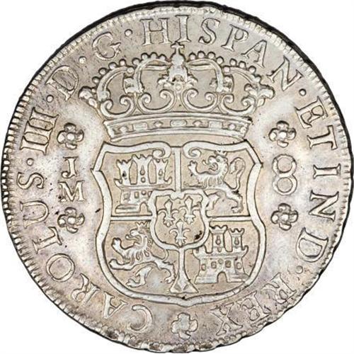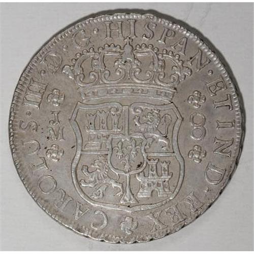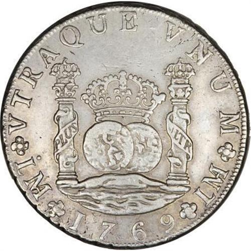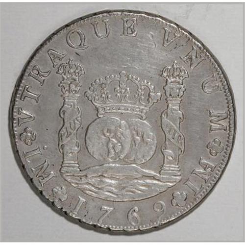 <B>Carlos III Pillar 8 Reales 1769-JM,</B></I> KM-A64.2, dot above left mintmark, choice XF-AU, extremely sharp details, lightly cleaned and now with subtle gray and gold toning.<BR><BR><b>Shipping:</b> Coins & Currency (<a target="_blank" href="http://www.heritageauctions.com/common/shipping.php">view shipping information</a>)