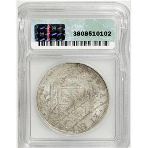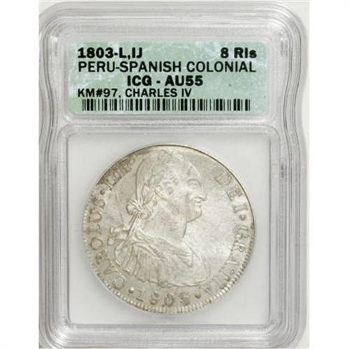 <B>Carlos IIII 8 Reales 1803-IJ, </B></I> KM97, AU55 ICG, fully lustrous with aged slate gray patina, minor hairlines in the exposed fields. Very close to mint state.<BR><BR><b>Shipping:</b> Coins & Currency (<a target="_blank" href="http://www.heritageauctions.com/common/shipping.php">view shipping information</a>)