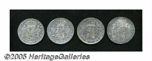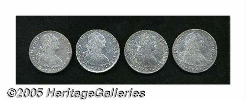 <B>Carlos IIII 8 Reales - Four Nice Examples, </B></I>KM97, including: 1796-IJ, XF, 1797-IJ, XF but harshly cleaned and somewhat porous, 1798-IJ, highly lustrous XF-AU, and 1800-IJ, lustrous AXF, few tiny flaws. A well above average grouping of these popular "bustos." <B>Sold as is, no return lot.</B></I>