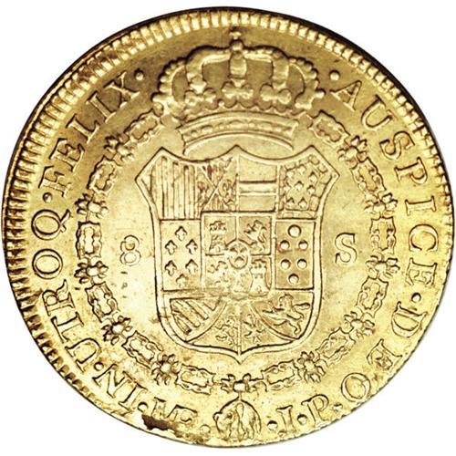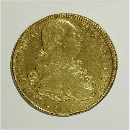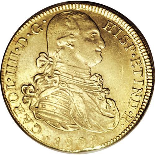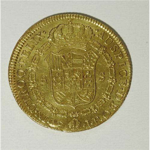 <B>Carlos IIII gold 8 Escudos 1808-JP, </B></I>KM101, nice lustrous XF+, problem-free planchet and good eye appeal. What may appear to be a flaw below the date is actually the result of a slightly thin area in the planchet, resulting in a weak strike at that point.<BR><BR><b>Shipping:</b> Coins & Currency (<a target="_blank" href="http://www.heritageauctions.com/common/shipping.php">view shipping information</a>)