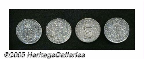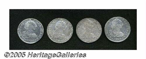 <B>Carlos IV 8 Reales - Four Examples, </B></I>KM87, transitional type with bust of Carlos III: 1789-IJ, nice AVF and scarce, 1790-IJ, F-VF, cleaned long ago and now toning, soft strike, 1790-IJ, lustrous VF+, somewhat unevenly cleaned, and 1791-IJ, AVF, cleaned with some remaining oxidation. A very useful group of this scarce type. <B>Sold as is, no return lot.</B></I>